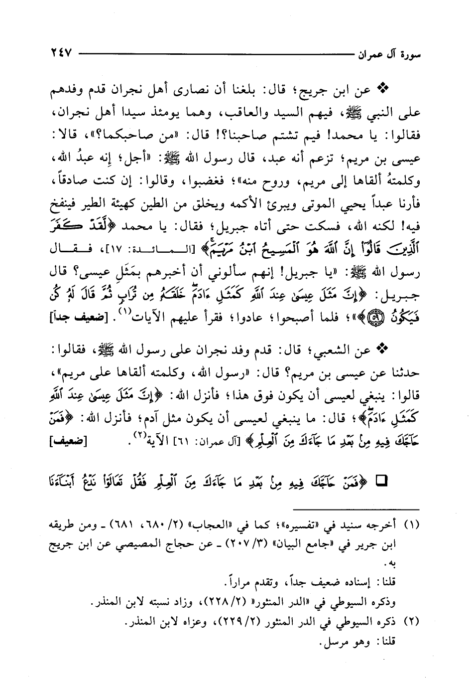 * عن ابن جريج؛ قال: بلغنا أن نصارى أهل نجران قدم وفدهم على النبي - صلى الله عليه وسلم -، فيهم السيد والعاقب، وهما يومئذ سيدا أهل نجران، فقالوا: يا محمد! فيم تشتم صاحبنا؟! قال: "من صاحبكما؟ "، قالا: عيسى بن مريم؛ تزعم أنه عبد، قال رسول الله - صلى الله عليه وسلم -: "أجل؛ إِنه عبدُ الله، وكلمتهُ ألقاها إلى مريم، وروح منه"؛ فغضبوا، وقالوا: إن كنت صادقاً، فأرنا عبداً يحيي الموتى ويبرئ الأكمه ويخلق من الطين كهيئة الطير فينفخ فيه! لكنه الله، فسكت حتى أتاه جبريل؛ فقال: يا محمد {لقَدْ كَفَرَ الَّذِينَ قَالُوا إِنَّ اللهَ هُوَ الْمَسِيحُ ابْنُ مَرْيَمَ} [المائدة: 17]، فقال رسول الله - صلى الله عليه وسلم -: "يا جبريل! إنهم سألوني أن أخبرهم بمَثَلِ عيسى؟ قال جبريل: {إِنَّ مَثَلَ عِيسَى عِنْدَ اللهِ كَمَثَلِ آدَمَ خَلَقَهُ مِنْ تُرَابٍ ثُمَّ قَالَ لَهُ كُنْ فَيَكُونُ (59)} "؛ فلما أصبحوا؛ عادوا؛ فقرأ عليهم الآيات (¬1). [ضعيف جداً]