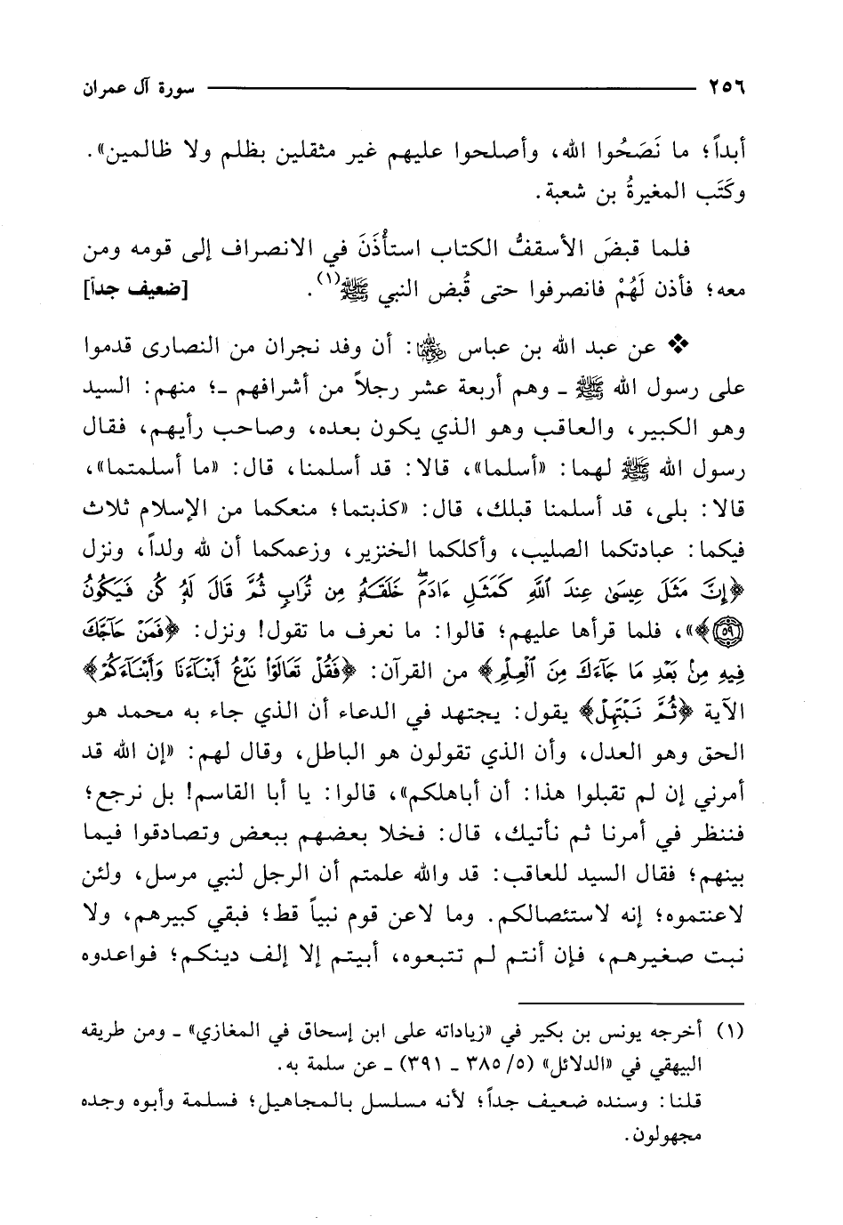 * عن عبد الله بن عباس -رضي الله عنهما-: أن وفد نجران من النصارى قدموا على رسول الله - صلى الله عليه وسلم -وهم أربعة عشر رجلاً من أشرافهم-؛ منهم: السيد وهو الكبير، والعاقب وهو الذي يكون بعده، وصاحب رأيهم، فقال رسول الله - صلى الله عليه وسلم - لهما: "أسلما"، قالا: قد أسلمنا، قال: "ما أسلمتما"، قالا: بلى، قد أسلمنا قبلك، قال: "كذبتما؛ منعكما من الإِسلام ثلاث فيكما: عبادتكما الصليب، وأكلكما الخنزير، وزعمكما أن لله ولداً، ونزل {إِنَّ مَثَلَ عِيسَى عِنْدَ اللهِ كَمَثَلِ آدَمَ خَلَقَهُ مِنْ تُرَابٍ ثُمَّ قَالَ لَهُ كُنْ فَيَكُونُ (59)} "، فلما قرأها عليهم؛ قالوا: ما نعرف ما تقول! ونزل: {فَمَنْ حَاجَّكَ فِيهِ مِنْ بَعْدِ مَا جَاءَكَ مِنَ الْعِلْمِ} من القرآن: {فَقُلْ تَعَالَوْا نَدْعُ أَبْنَاءَنَا وَأَبْنَاءَكُمْ} الآية {ثُمَّ نَبْتَهِل}: يقول: يجتهد في الدعاء أن الذي جاء به محمد هو الحق وهو العدل، وأن الذي تقولون هو الباطل، وقال لهم: "إن الله قد أمرني إن لم تقبلوا هذا: أن أباهلكم"، قالوا: يا أبا القاسم! بل نرجع؛ فننظر في أمرنا ثم نأتيك، قال: فخلا بعضهم ببعض وتصادقوا فيما بينهم؛ فقال السيد للعاقب: قد والله علمتم أن الرجل لنبي مرسل، ولئن لاعنتموه؛ إنه لاستئصالكم. وما لاعن قوم نبياً قط؛ فبقي كبيرهم، ولا نبت صغيرهم، فإن أنتم لم تتبعوه، أبيتم إلا إلف دينكم؛ فواعدوه