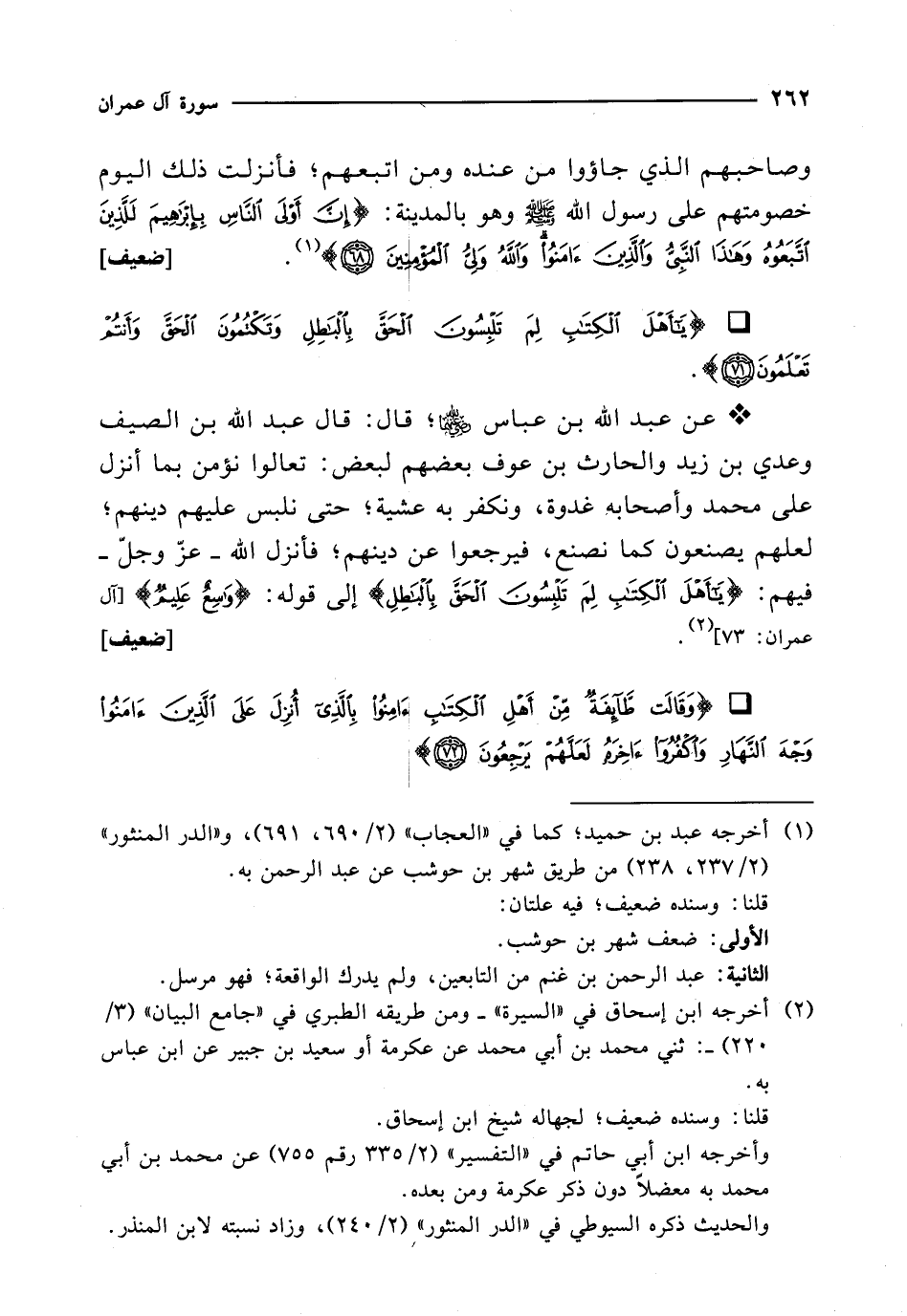 * عن عبد الله بن عباس -رضي الله عنهما-؛ قال: قال عبد الله بن الصيف وعدي بن زيد والحارث بن عوف بعضهم لبعض: تعالوا نؤمن بما أنزل على محمد وأصحابه غدوة، ونكفر به عشية؛ حتى نلبس عليهم دينهم؛ لعلهم يصنعون كما نصنع، فيرجعوا عن دينهم؛ فأنزل الله -عزّ وجلّ- فيهم: {يَاأَهْلَ الْكِتَابِ لِمَ تَلْبِسُونَ الْحَقَّ بِالْبَاطِلِ} إلى قوله: {وَاسِعٌ عَلِيمٌ} [آل عمران: 73] (¬2). [ضعيف]
