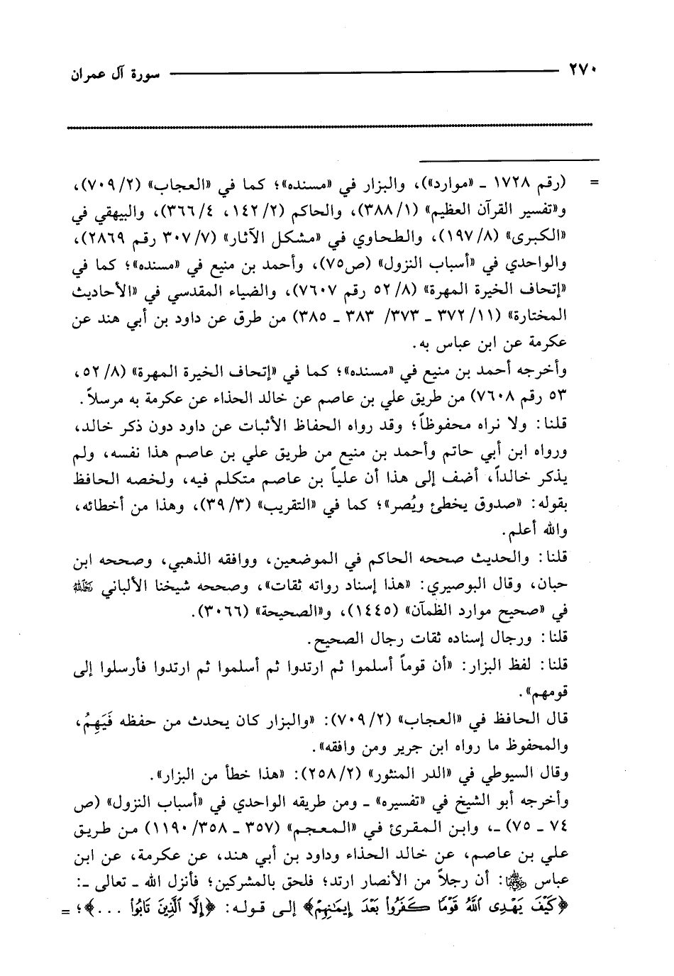 وأخرجه أبو الشيخ في "تفسيره" -ومن طريقه الواحدي في "أسباب النزول" (ص 74 - 75) -، وابن المقرئ في "المعجم" (357 - 358/ 1190) من طريق علي بن عاصم، عن خالد الحذاء وداود بن أبي هند، عن عكرمة، عن ابن عباس -رضي الله عنهما-: أن رجلاً من الأنصار ارتد؛ فلحق بالمشركين؛ فأنزل الله -تعالى-: {كَيْفَ يَهْدِي الله قَوْمًا كَفَرُوا بَعْدَ إِيمَانِهِمْ} إلى قوله: {إِلَّا الَّذِينَ تَابُوا. . .}؛ =