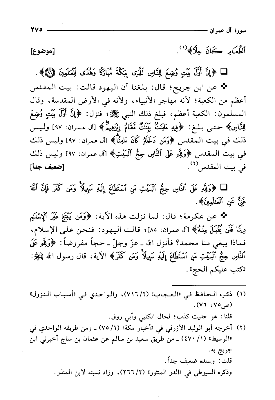 * عن ابن جريج؛ قال: بلغنا أن اليهود قالت: بيت المقدس أعظم من الكعبة؛ لأنه مهاجر الأنبياء، ولأنه في الأرض المقدسة، وقال المسلمون: الكعبة أعظم، فبلغ ذلك النبي - صلى الله عليه وسلم -؛ فنزل: {إِنَّ أَوَّلَ بَيْتٍ وُضِعَ لِلنَّاسِ} حتى بلغ: {فِيهِ آيَاتٌ بَيِّنَاتٌ مَقَامُ إِبْرَاهِيمَ} [آل عمران: 97]، وليس ذلك في بيت المقدس {وَمَنْ دَخَلَهُ كَانَ آمِنًا} [آل عمران: 97] وليس ذلك في بيت المقدس {وَلِلَّهِ عَلَى النَّاسِ حِجُّ الْبَيْتِ} [آل عمران: 97] وليس ذلك في بيت المقدس (¬2). [ضعيف جداً]