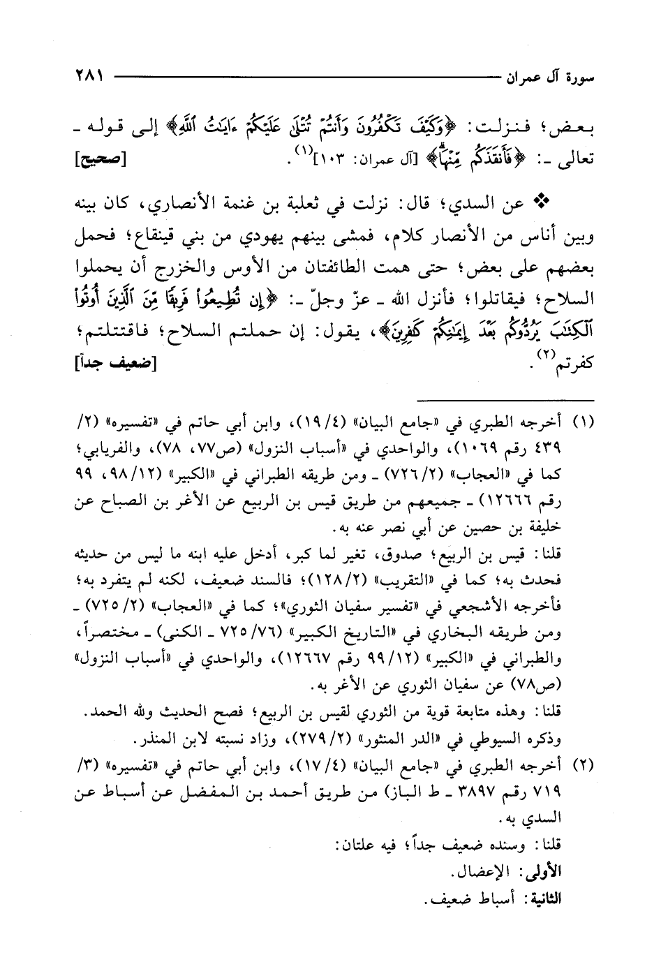 * عن السدي؛ قال: نزلت في ثعلبة بن غنمة الأنصاري، كان بينه وبين أناس من الأنصار كلام، فمشى بينهم يهودي من بني قينقاع؛ فحمل بعضهم على بعض؛ حتى همت الطائفتان من الأوس والخزرج أن يحملوا السلاح؛ فيقاتلوا؛ فأنزل الله -عزّ وجلّ-: {إِنْ تُطِيعُوا فَرِيقًا مِنَ الَّذِينَ أُوتُوا الْكِتَابَ يَرُدُّوكُمْ بَعْدَ إِيمَانِكُمْ كَافِرِينَ}، يقول: إن حملتم السلاح؛ فاقتتلتم؛ كفرتم (¬2). [ضعيف جداً]