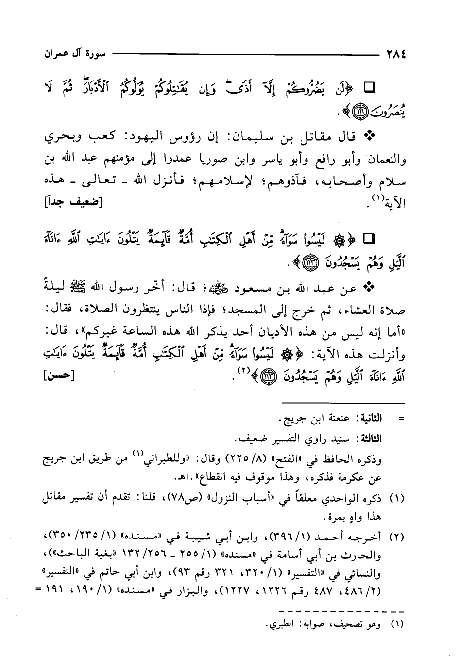 * عن عبد الله بن مسعود -رضي الله عنه-؛ قال: أخّر رسول الله - صلى الله عليه وسلم - ليلةً صلاة العشاء، ثم خرج إلى المسجد؛ فإذا الناس ينتظرون الصلاة، فقال: "أما إنه ليس من هذه الأديان أحد يذكر الله هذه الساعة غيركم"، قال: وأنزلت هذه الآية: {لَيْسُوا سَوَاءً مِنْ أَهْلِ الْكِتَابِ أُمَّةٌ قَائِمَةٌ يَتْلُونَ آيَاتِ اللهِ آنَاءَ اللَّيْلِ وَهُمْ يَسْجُدُونَ (113)} (¬2). [حسن]