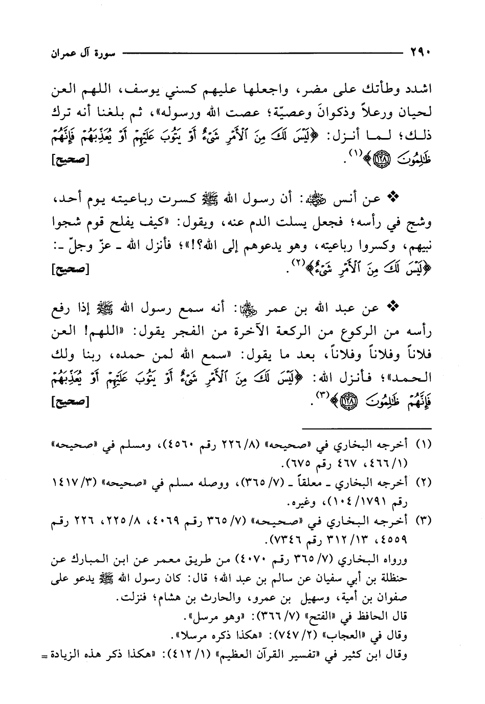 * عن عبد الله بن عمر -رضي الله عنهما-: أنه سمع رسول الله - صلى الله عليه وسلم - إذا رفع رأسه من الركوع من الركعة الآخرة من الفجر يقول: "اللهم! العن فلاناً وفلاناً وفلاناً، بعد ما يقول: "سمع الله لمن حمده، ربنا ولك الحمد"؛ فأنزل الله: {لَيْسَ لَكَ مِنَ الْأَمْرِ شَيْءٌ أَوْ يَتُوبَ عَلَيْهِمْ أَوْ يُعَذِّبَهُمْ فَإِنَّهُمْ ظَالِمُونَ (128)} (¬3). [صحيح]