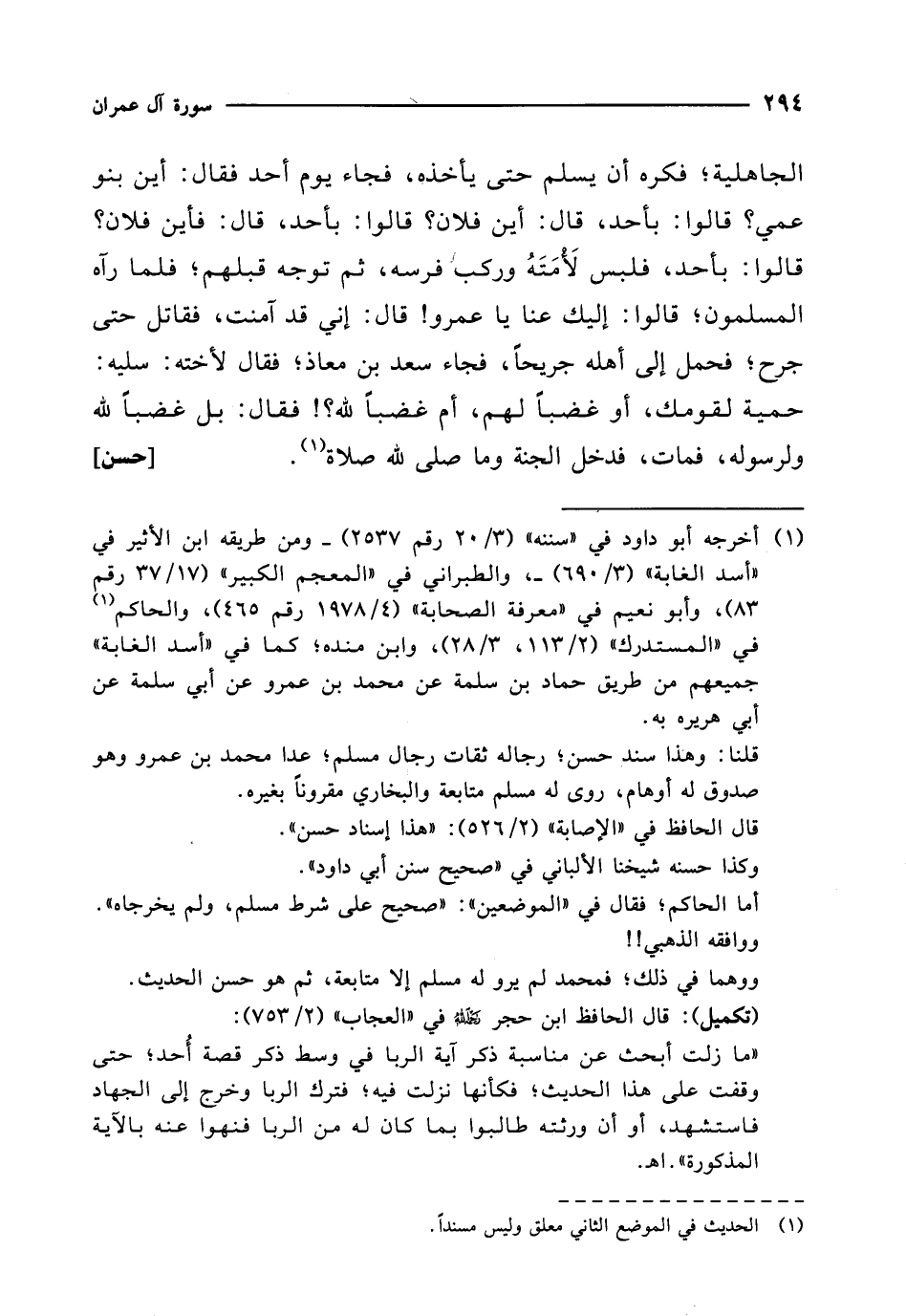 "ما زلت أبحث عن مناسبة ذكر آية الربا في وسط ذكر قصة أُحد؛ حتى وقفت على هذا الحديث؛ فكأنها نزلت فيه؛ فترك الربا وخرج إلى الجهاد فاستشهد، أو أن ورثته طالبوا بما كان له من الربا فنهوا عنه بالآية المذكورة". اهـ.