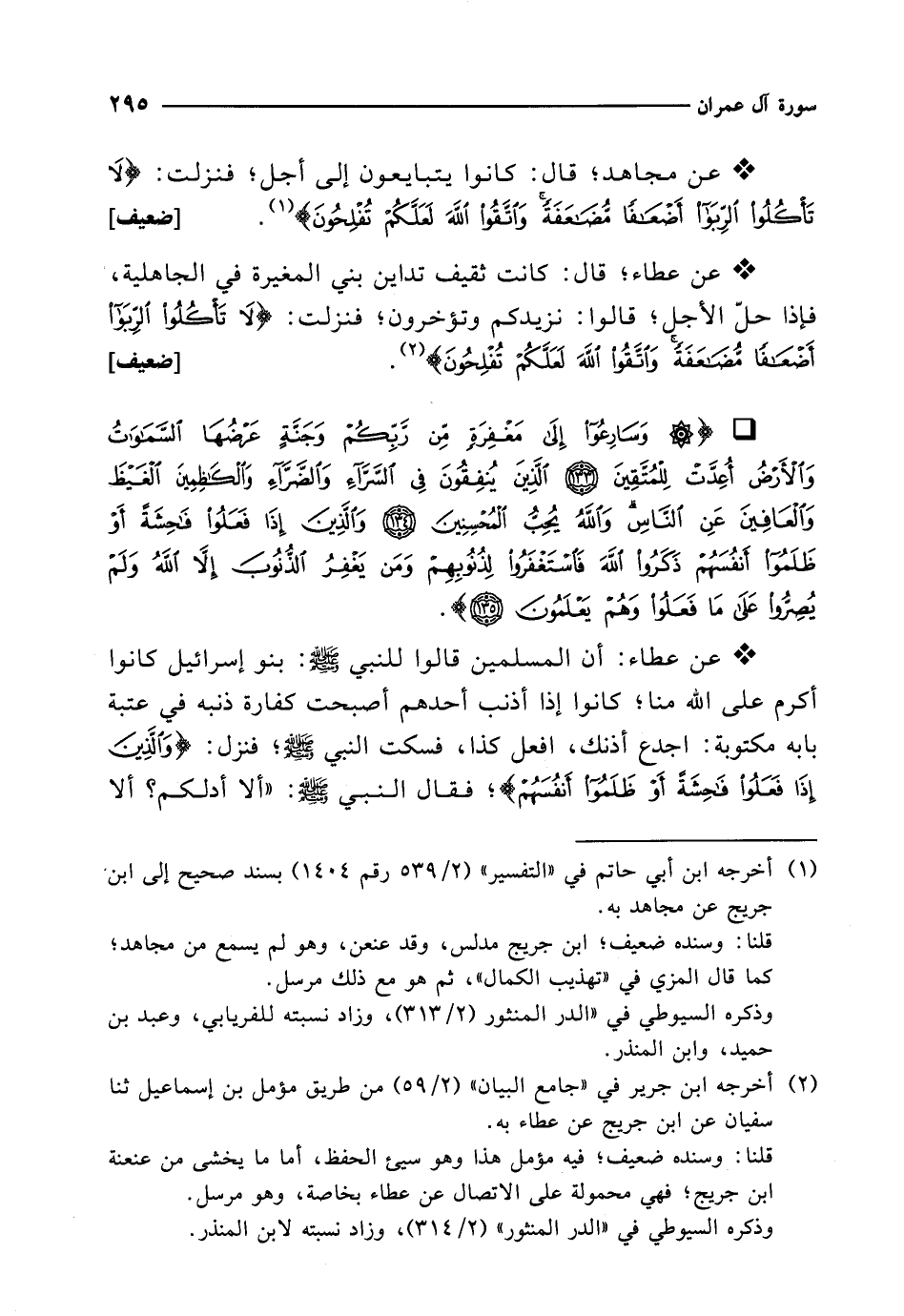 * عن عطاء؛ قال: كانت ثقيف تداين بني المغيرة في الجاهلية، فإذا حلّ الأجل؛ قالوا: نزيدكم وتؤخرون؛ فنزلت: {لَا تَأْكُلُوا الرِّبَا أَضْعَافُ امُضَاعَفَةً وَاتَّقُوا اللهَ لَعَلَّكُمْ تُفْلِحُونَ} (¬2). [ضعيف]