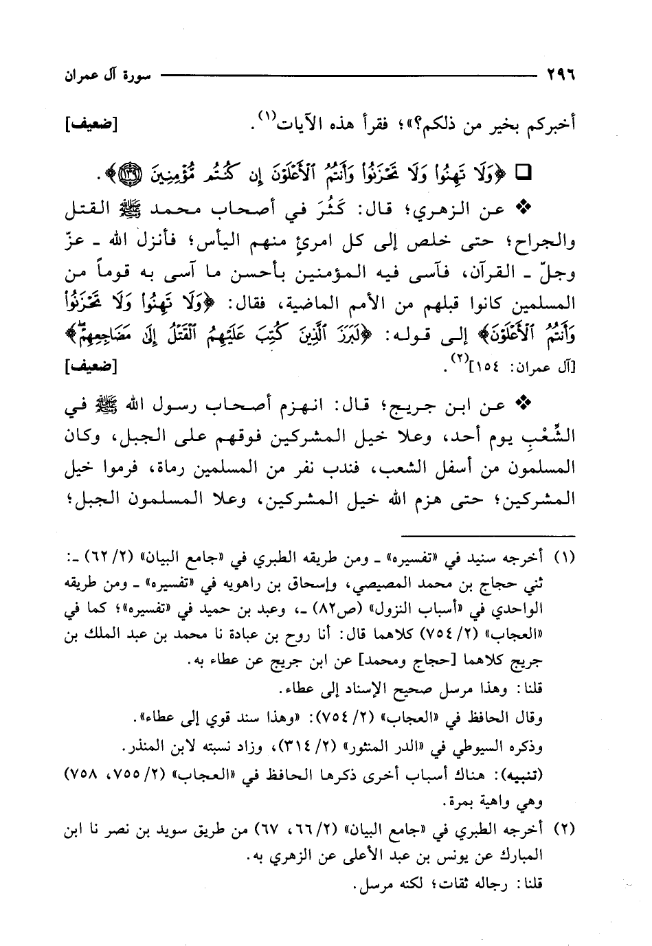 * عن الزهري؛ قال: كَثُرَ في أصحاب محمد - صلى الله عليه وسلم - القتل والجراح؛ حتى خلص إلى كل امرئٍ منهم اليأس؛ فأنزل الله -عزّ وجلّ- القرآن، فآسى فيه المؤمنين بأحسن ما آسى به قوماً من المسلمين كانوا قبلهم من الأمم الماضية، فقال: {وَلَا تَهِنُوا وَلَا تَحْزَنُوا وَأَنْتُمُ الْأَعْلَوْنَ} إلى قوله: {لَبَرَزَ الَّذِينَ كُتِبَ عَلَيْهِمُ الْقَتْلُ إِلَى مَضَاجِعِهِمْ} [آل عمران: 154] (¬2). [ضعيف]