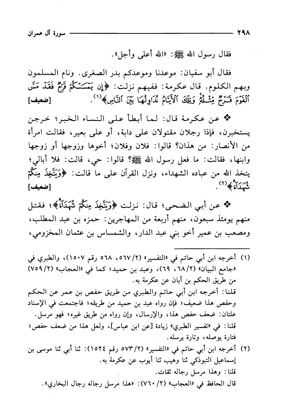 * عن عكرمة قال: لما أبطأ على النساء الخبر؛ خرجن يستخبرن، فإذا رجلان مقتولان على دابة، أو على بعير، فقالت امرأة من الأنصار: من هذان؟ قالوا: فلان وفلان؛ أخوها وزوجها أو زوجها وابنها، فقالت: ما فعل رسول الله - صلى الله عليه وسلم -؟ قالوا: حي، قالت: فلا أبالي؛ يتخذ الله من عباده الشهداء، ونزل القرآن على ما قالت: {وَيَتَّخِذَ مِنْكُمْ شُهَدَاءَ} (¬2). [ضعيف]