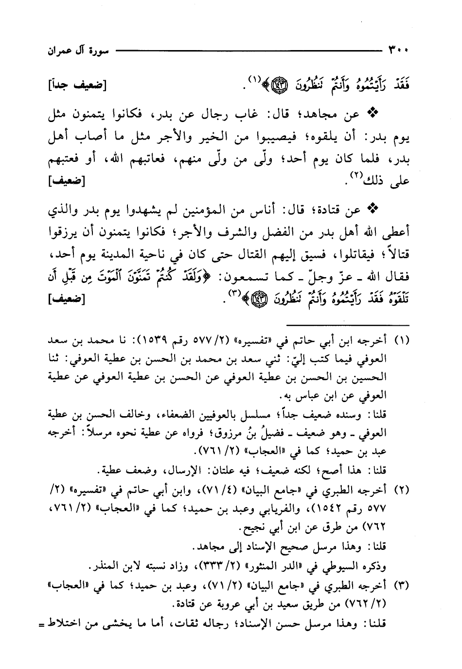 قلنا: وسنده ضعيف جداً؛ مسلسل بالعوفيين الضعفاء, وخالف الحسن بن عطية العوفي -وهو ضعيف- فضيلُ بنُ مرزوق؛ فرواه عن عطية نحوه مرسلاً: أخرجه عبد بن حميد؛ كما في "العجاب" (2/ 761).