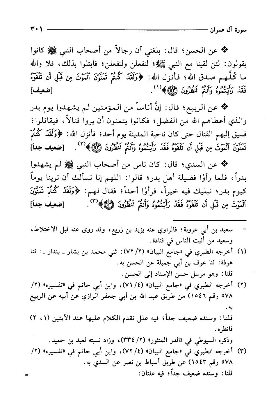 * عن الربيع؛ قال: إنَّ أناساً من المؤمنين لم يشهدوا يوم بدر والذي أعطاهم الله من الفضل؛ فكانوا يتمنون أن يروا قتالاً، فيقاتلوا؛ فسيق إليهم القتال حتى كان ناحية المدينة يوم أحد؛ فأنزل الله: {وَلَقَدْ كُنْتُمْ تَمَنَّوْنَ الْمَوْتَ مِنْ قَبْلِ أَنْ تَلْقَوْهُ فَقَدْ رَأَيْتُمُوهُ وَأَنْتُمْ تَنْظُرُونَ (143)} (¬2). [ضعيف جداً]