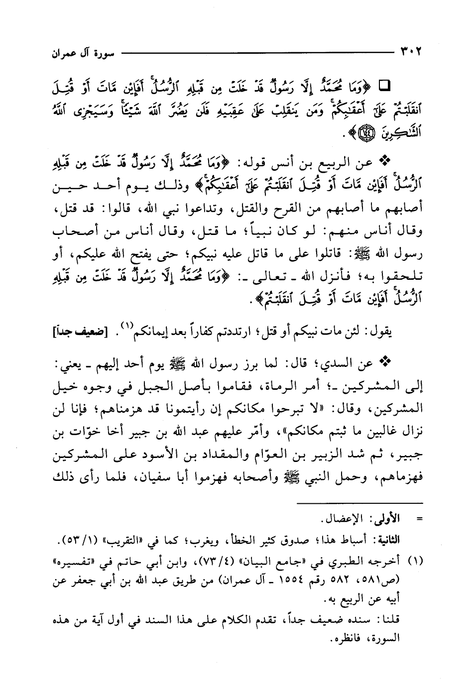 * عن الربيع بن أنس قوله: {وَمَا مُحَمَّدٌ إِلَّا رَسُولٌ قَدْ خَلَتْ مِنْ قَبْلِهِ الرُّسُلُ أَفَإِنْ مَاتَ أَوْ قُتِلَ انْقَلَبْتُمْ عَلَى أَعْقَابِكُمْ} وذلك يوم أحد حين أصابهم ما أصابهم من القرح والقتل، وتداعوا نبي الله، قالوا: قد قتل، وقال أناس منهم: لو كان نبياً؛ ما قتل، وقال أناس من أصحاب رسول الله - صلى الله عليه وسلم -: قاتلوا على ما قاتل عليه نبيكم؛ حتى يفتح الله عليكم، أو تلحقوا به؛ فأنزل الله -تعالى-: {وَمَا مُحَمَّدٌ إِلَّا رَسُولٌ قَدْ خَلَتْ مِنْ قَبْلِهِ الرُّسُلُ أَفَإِنْ مَاتَ أَوْ قُتِلَ انْقَلَبْتُمْ}.