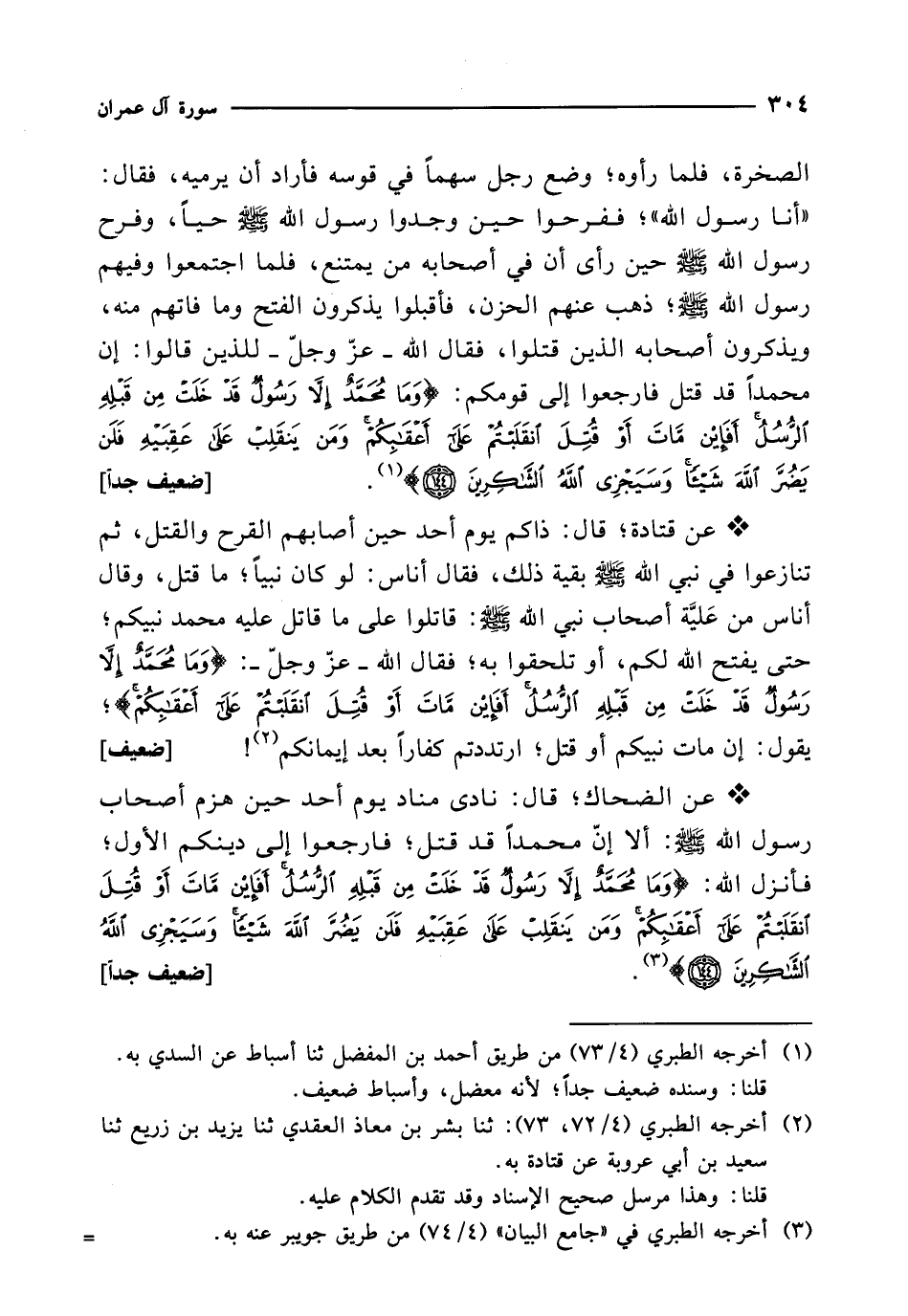 * عن الضحاك؛ قال: نادى مناد يوم أحد حين هزم أصحاب رسول الله - صلى الله عليه وسلم -: ألا إنّ محمداً قد قتل؛ فارجعوا إلى دينكم الأول؛ فأنزل الله: {وَمَا مُحَمَّدٌ إِلَّا رَسُولٌ قَدْ خَلَتْ مِنْ قَبْلِهِ الرُّسُلُ أَفَإِنْ مَاتَ أَوْ قُتِلَ انْقَلَبْتُمْ عَلَى أَعْقَابِكُمْ وَمَنْ يَنْقَلِبْ عَلَى عَقِبَيْهِ فَلَنْ يَضُرَّ اللَّهَ شَيْئًا وَسَيَجْزِي اللَّهُ الشَّاكِرِينَ (144)} (¬3) [ضعيف جداً]