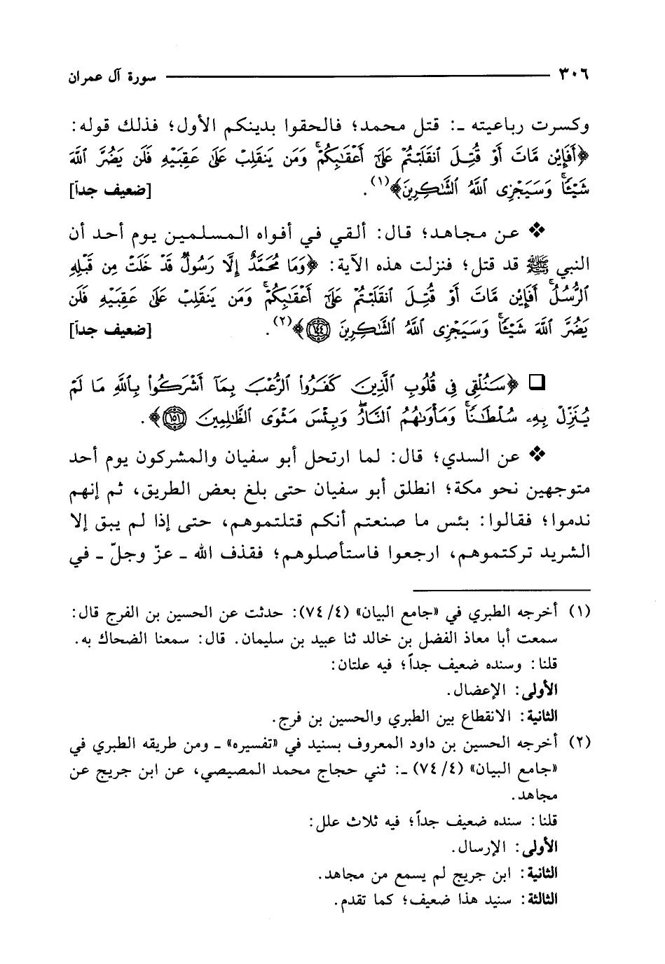 * عن مجاهد؛ قال: ألقي في أفواه المسلمين يوم أحد أن النبي - صلى الله عليه وسلم - قد قتل؛ فنزلت هذه الآية: {وَمَا مُحَمَّدٌ إِلَّا رَسُولٌ قَدْ خَلَتْ مِنْ قَبْلِهِ الرُّسُلُ أَفَإِنْ مَاتَ أَوْ قُتِلَ انْقَلَبْتُمْ عَلَى أَعْقَابِكُمْ وَمَنْ يَنْقَلِبْ عَلَى عَقِبَيْهِ فَلَنْ يَضُرَّ اللَّهَ شَيْئًا وَسَيَجْزِي اللَّهُ الشَّاكِرِينَ (114)} (¬2). [ضعيف جداً]