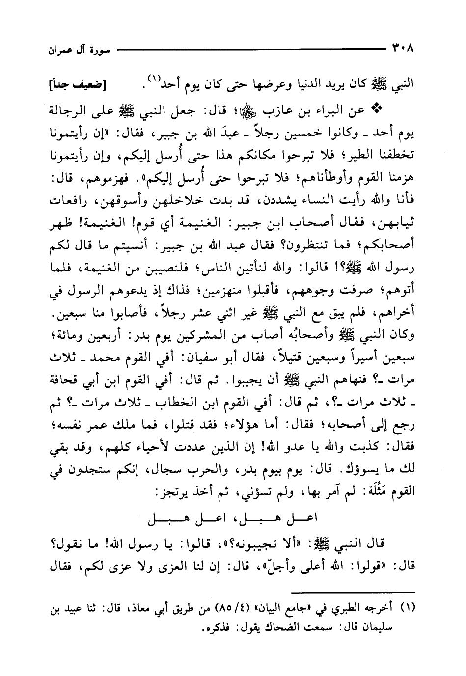 قال النبي - صلى الله عليه وسلم -: "ألا تجيبونه؟ "، قالوا: يا رسول الله! ما نقول؟ قال: "قولوا: الله أعلى وأجلّ"، قال: إن لنا العزى ولا عزى لكم، فقال