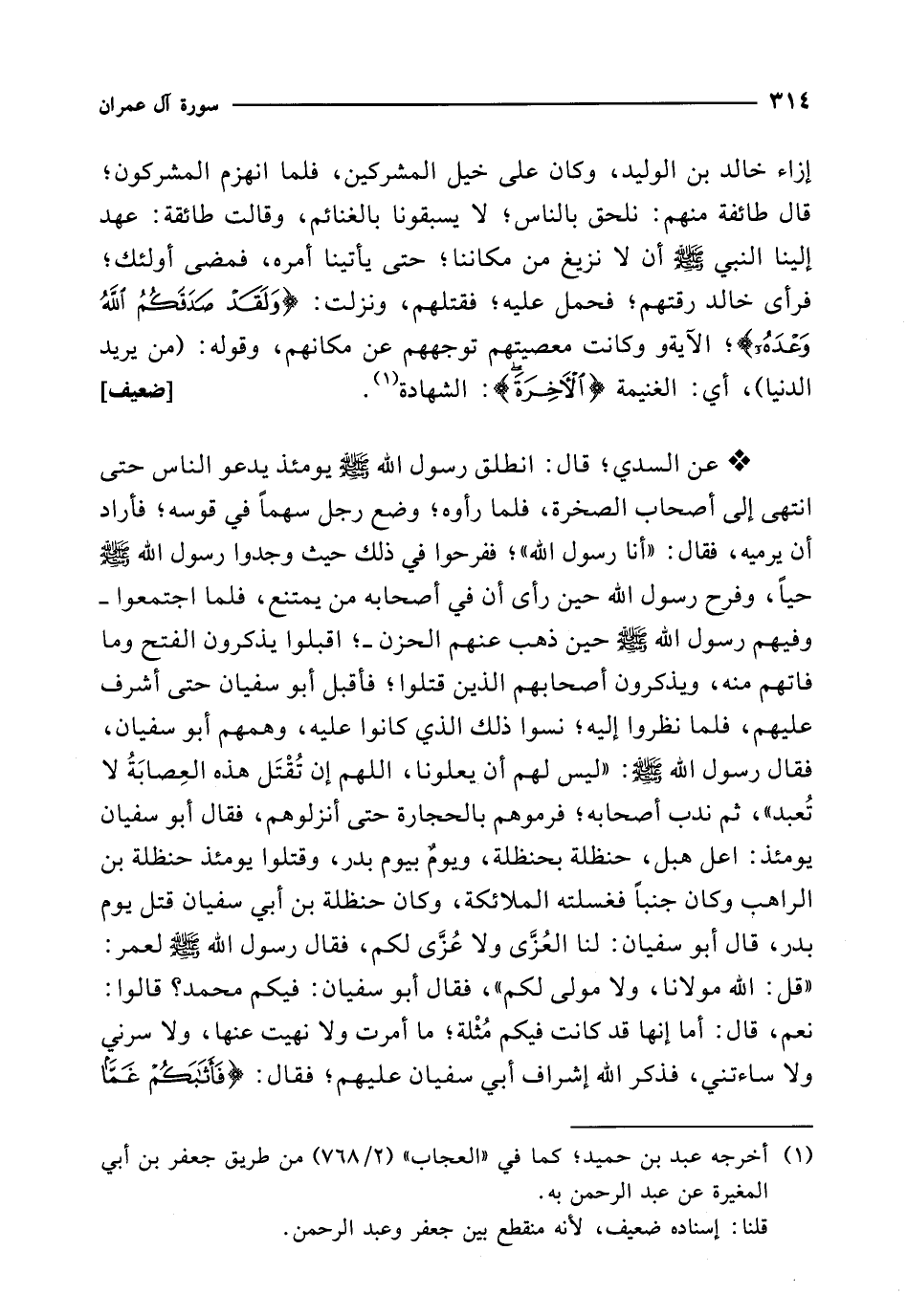 * عن السدي؛ قال: انطلق رسول الله - صلى الله عليه وسلم - يومئذ يدعو الناس حتى انتهى إلى أصحاب الصخرة، فلما رأوه؛ وضع رجل سهماً في قوسه؛ فأراد أن يرميه، فقال: "أنا رسول الله"؛ ففرحوا في ذلك حيث وجدوا رسول الله - صلى الله عليه وسلم - حياً، وفرح رسول الله حين رأى أن في أصحابه من يمتنع، فلما اجتمعوا -وفيهم رسول الله - صلى الله عليه وسلم - حين ذهب عنهم الحزن-؛ اقبلوا يذكرون الفتح وما فاتهم منه، ويذكرون أصحابهم الذين قتلوا؛ فأقبل أبو سفيان حتى أشرف عليهم، فلما نظروا إليه؛ نسوا ذلك الذي كانوا عليه، وهمهم أبو سفيان، فقال رسول الله - صلى الله عليه وسلم -: "ليس لهم أن يعلونا، اللهم إن تُقْتَل هذه العِصابَةُ لا تُعبد"، ثم ندب أصحابه؛ فرموهم بالحجارة حتى أنزلوهم، فقال أبو سفيان يومئذ: اعل هبل، حنظلة بحنظلة، ويومٌ بيوم بدر، وقتلوا يومئذ حنظلة بن الراهب وكان جنباً فغسلته الملائكة، وكان حنظلة بن أبي سفيان قتل يوم بدر، قال أبو سفيان: لنا العُزَّى ولا عُزَّى لكم، فقال رسول الله - صلى الله عليه وسلم - لعمر: "قل: الله مولانا، ولا مولى لكم"، فقال أبو سفيان: فيكم محمد؟ قالوا: نعم، قال: أما إنها قد كانت فيكم مُثْلة؛ ما أمرت ولا نهيت عنها؛ ولا سرني ولا ساءتني، فذكر الله إشراف أبي سفيان عليهم؛ فقال: {فَأَثَابَكُمْ غَمًّا