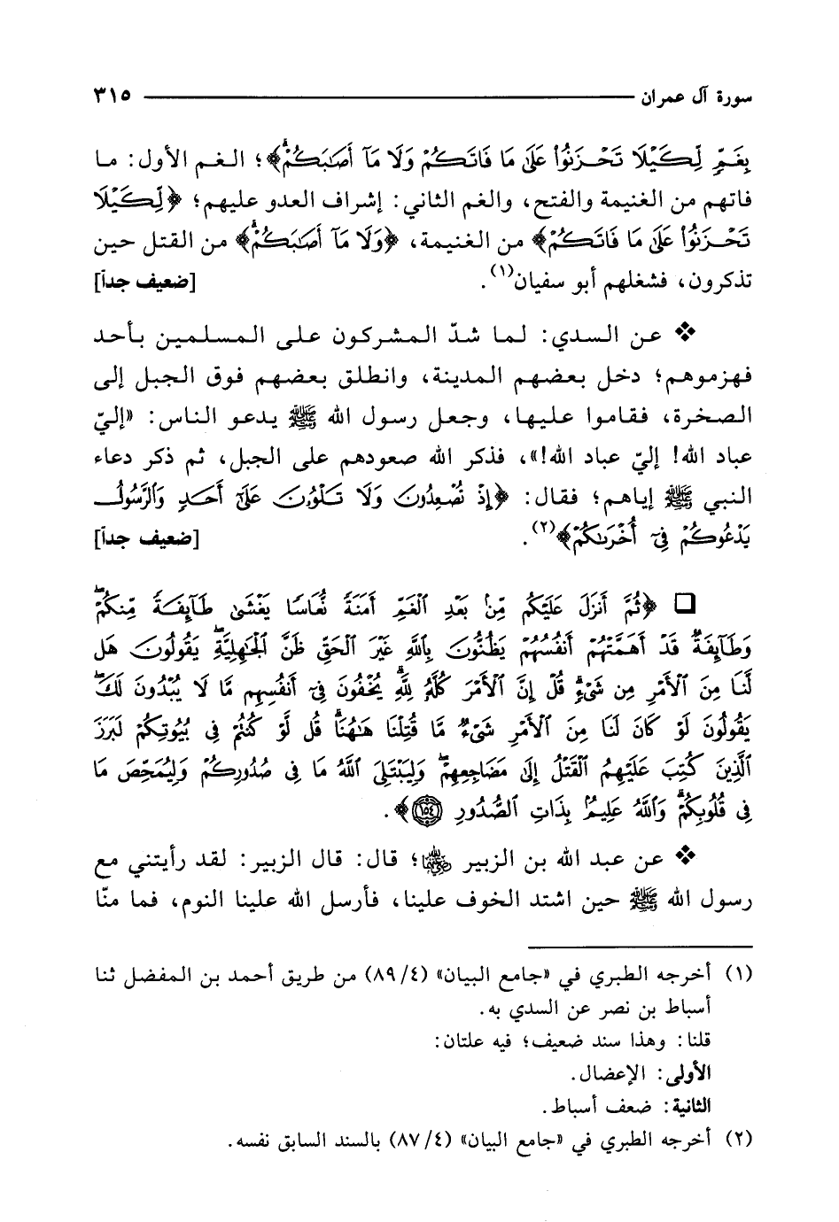* عن السدي: لما شدّ المشركون على المسلمين بأحد فهزموهم؛ دخل بعضهم المدينة، وانطلق بعضهم فوق الجبل إلى الصخرة، فقاموا عليها، وجعل رسول الله - صلى الله عليه وسلم - يدعو الناس: "إليّ عباد الله! إليّ عباد الله! "، فذكر الله صعودهم على الجبل، ثم ذكر دعاء النبي - صلى الله عليه وسلم - إياهم؛ فقال: {إِذْ تُصْعِدُونَ وَلَا تَلْوُونَ عَلَى أَحَدٍ وَالرَّسُولُ يَدْعُوكُمْ فِي أُخْرَاكُمْ} (¬2). [ضعيف جداً]