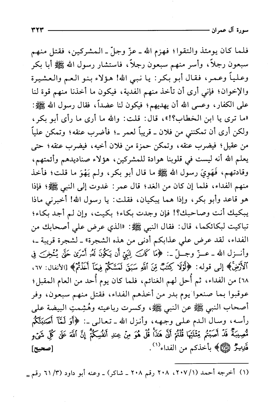 فلما كان يومئذ والتقوا؛ فهزم الله -عزّ وجلّ- المشركين، فقتل منهم سبعون رجلاً، وأسر منهم سبعون رجلاً، فاستشار رسول الله - صلى الله عليه وسلم - أبا بكر وعليًا وعمر، فقال أبو بكر: يا نبي الله! هؤلاء بنو العم والعشيرة والإخوان؛ فإني أرى أن تأخذ منهم الفدية، فيكون ما أخذنا منهم قوة لنا على الكفار، وعسى الله أن يهديهم؛ فيكون لنا عضدًا، فقال رسول الله - صلى الله عليه وسلم -: "ما ترى يا ابن الخطاب؟! "، قال: قلت: والله ما أرى ما رأى أبو بكر، ولكن أرى أن تمكنني من فلان -قريباً لعمر-؛ فأضرب عنقه؛ وتمكن علياً من عقيل؛ فيضرب عنقه، وتمكن حمزة من فلان أخيه، فيضرب عنقه؛ حتى يعلم الله أنه ليست في قلوبنا هوادة للمشركين، هؤلاء صناديدهم وأئمتهم، وقادتهم، فَهَوِيَ رسول الله - صلى الله عليه وسلم - ما قال أبو بكر، ولم يَهْوَ ما قلت؛ فأخذ منهم الفداء، فلما إن كان من الغد؛ قال عمر: غدوت إلى النبي - صلى الله عليه وسلم -؛ فإذا هو قاعد وأبو بكر، وإذا هما يبكيان، فقلت: يا رسول الله! أخبرني ماذا يبكيك أنت وصاحبك؟! فإن وجدت بكاء؛ بكيت، وإن لم أجد بكاء؛ تباكيت لبكائكما، قال: فقال النبي - صلى الله عليه وسلم -: "الذي عرض علي أصحابك من الفداء، لقد عرض علي عذابكم أدنى من هذه الشجرة" -لشجرة قريبة-، وأنزل الله -عزّ وجلّ-: {مَا كَانَ لِنَبِيٍّ أَنْ يَكُونَ لَهُ أَسْرَى حَتَّى يُثْخِنَ فِي الْأَرْضِ} إلى قوله: {لَوْلَا كِتَابٌ مِنَ اللَّهِ سَبَقَ لَمَسَّكُمْ فِيمَا أَخَذْتُمْ} [الأنفال: 67, 68] من الفداء، ثم أُحل لهم الغنائم، فلما كان يوم أُحد من العام المقبل؛ عوقبوا بما صنعوا يوم بدر من أخذهم الفداء، فقتل منهم سبعون، وفر أصحاب النبي - صلى الله عليه وسلم - عن النبي - صلى الله عليه وسلم -، وكسرت رباعيته وهُشِمتِ البيضة على رأسه، وسال الدم على وجهه، وأنزل الله -تعالى-: {أَوَلَمَّا أَصَابَتْكُمْ مُصِيبَةٌ قَدْ أَصَبْتُمْ مِثْلَيْهَا قُلْتُمْ أَنَّى هَذَا قُلْ هُوَ مِنْ عِنْدِ أَنْفُسِكُمْ إِنَّ اللَّهَ عَلَى كُلِّ شَيْءٍ قَدِيرٌ (165)} بأخذكم من الفداء (¬1). [صحيح]