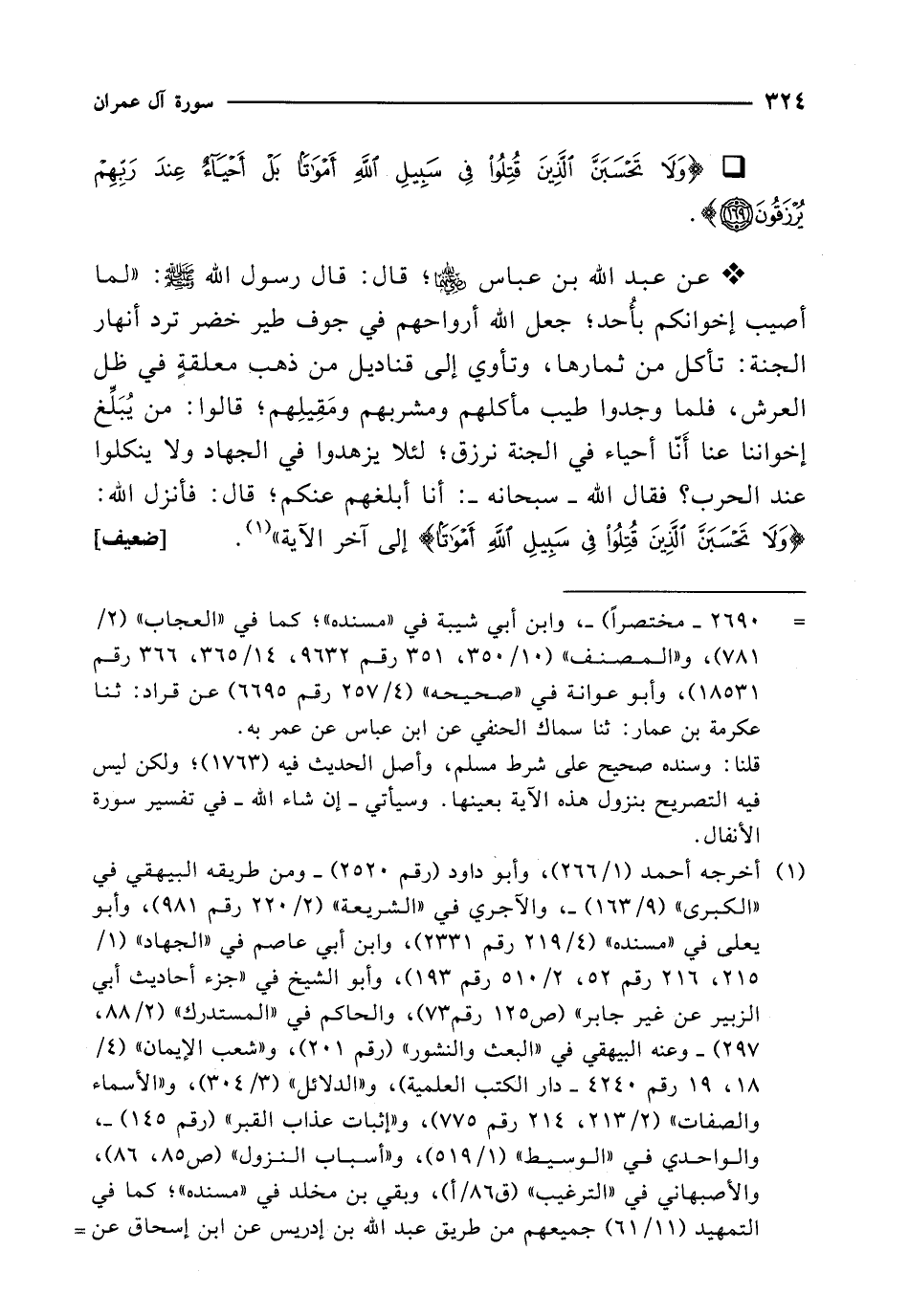 * عن عبد الله بن عباس -رضي الله عنهما-؛ قال: قال رسول الله - صلى الله عليه وسلم -: "لما أصيب إخوانكم بأُحد؛ جعل الله أرواحهم في جوف طير خضر ترد أنهار الجنة: تأكل من ثمارها، وتأوي إلى قناديل من ذهب معلقةٍ في ظل العرش، فلما وجدوا طيب مأكلهم ومشربهم ومَقِيلِهم؛ قالوا: من يُبَلِّغ إخواننا عنا أَنّا أحياء في الجنة نرزق؛ لئلا يزهدوا في الجهاد ولا ينكلوا عند الحرب؟ فقال الله -سبحانه-: أنا أبلغهم عنكم؛ قال: فأنزل الله: {وَلَا تَحْسَبَنَّ الَّذِينَ قُتِلُوا فِي سَبِيلِ اللَّهِ أَمْوَاتًا} إلى آخر الآية" (¬1). [ضعيف]