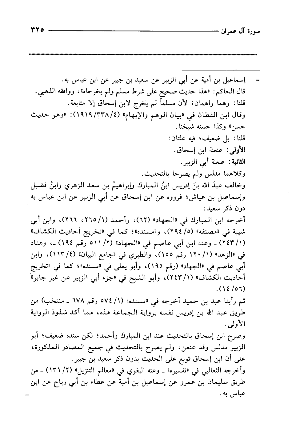 وصرح ابن إسحاق بالتحديث عند ابن المبارك وأحمد؛ لكن سنده ضعيف؛ أبو الزبير مدلس وقد عنعن، ولم يصرح بالتحديث في جميع المصادر المذكورة، على أن ابن إسحاق توبع على الحديث بدون ذكر سعيد بن جبير.