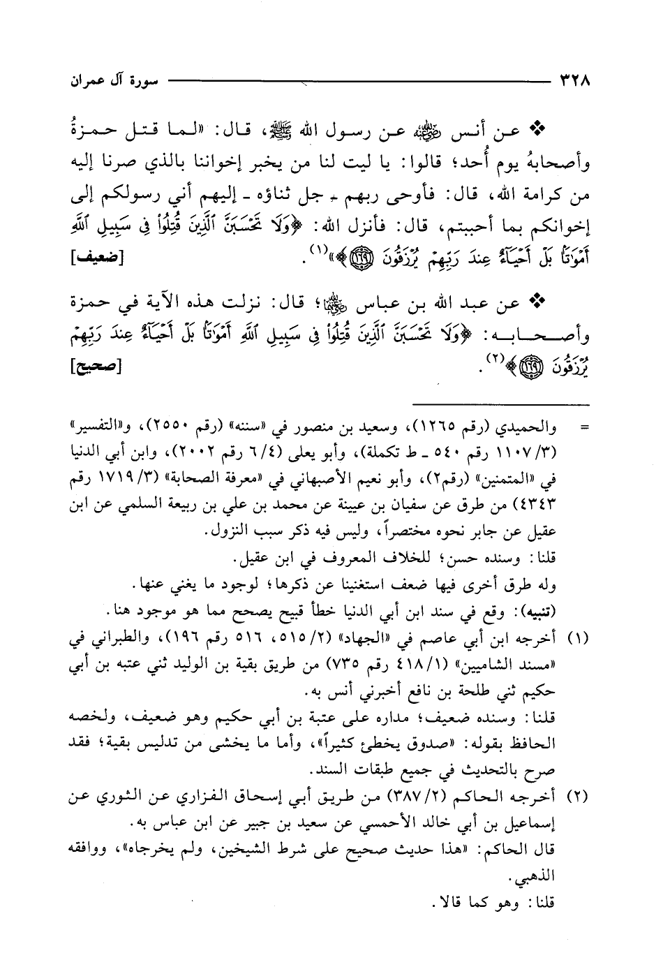 * عن عبد الله بن عباس -رضي الله عنهما-؛ قال: نزلت هذه الآية في حمزة وأصحابه: {وَلَا تَحْسَبَنَّ الَّذِينَ قُتِلُوا فِي سَبِيلِ اللَّهِ أَمْوَاتًا بَلْ أَحْيَاءٌ عِنْدَ رَبِّهِمْ يُرْزَقُونَ (169)} (¬2). [صحيح]