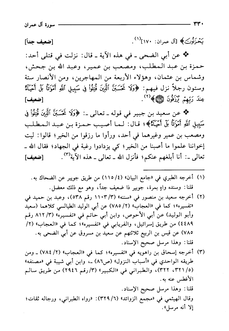 * عن سعيد بن جبير في قوله -تعالى-: {وَلَا تَحْسَبَنَّ الَّذِينَ قُتِلُوا فِي سَبِيلِ اللَّهِ أَمْوَاتًا بَلْ أَحْيَاءٌ}؛ قال: لما أصيب حمزة بن عبد المطلب ومصعب بن عمير وغيرهما في أحد، ورأوا ما رزقوا من الخير؛ قالوا: ليت إخواننا علموا ما أصبنا من الخير؛ كي يزدادوا رغبة في الجهاد؛ فقال الله -تعالى-: أنا أبلغهم عنكم؛ فأنزل الله -تعالى- هذه الآية (¬3). [ضعيف]