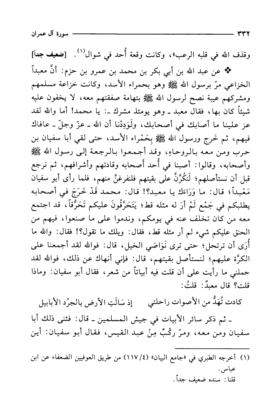 -ثم ذكر سائر الأبيات في جيش المسلمين- قال: فثنى ذلك أبا سفيان ومن معه، ومرّ ركْبٌ مِنْ عبد القيس، فقال أبو سفيان: أين