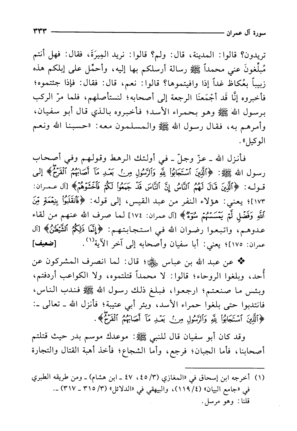 فأنزل الله -عزّ وجلّ- في أولئك الرهط وقولهم وفي أصحاب رسول الله - صلى الله عليه وسلم -: {الَّذِينَ اسْتَجَابُوا لِلَّهِ وَالرَّسُولِ مِنْ بَعْدِ مَا أَصَابَهُمُ الْقَرْحُ} إلى قوله: {الَّذِينَ قَالَ لَهُمُ النَّاسُ إِنَّ النَّاسَ قَدْ جَمَعُوا لَكُمْ فَاخْشَوْهُمْ} [آل عمران: 173]؛ يعني: هؤلاء النفر من عبد القيس، إلى قوله: {فَانْقَلَبُوا بِنِعْمَةٍ مِنَ اللَّهِ وَفَضْلٍ لَمْ يَمْسَسْهُمْ سُوءٌ} [آل عمران: 174] لما صرف الله عنهم من لقاء عدوهم، واتبعوا رضوان الله في استجابتهم: {إِنَّمَا ذَلِكُمُ الشَّيْطَانُ} [آل عمران: 175]؛ يعني: أبا سفيان وأصحابه إلى آخر الآية (¬1). [ضعيف]