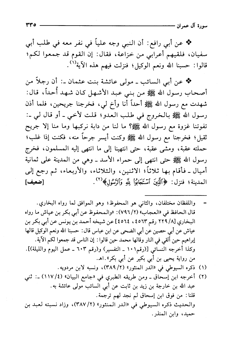 * عن أبي رافع: أن النبي وجه علياً في نفر معه في طلب أبي سفيان، فلقيهم أعرابي من خزاعة، فقال: إن القوم قد جمعوا لكم؛ قالوا: حسبنا الله ونعم الوكيل؛ فنزلت فيهم هذه الآية (¬1).