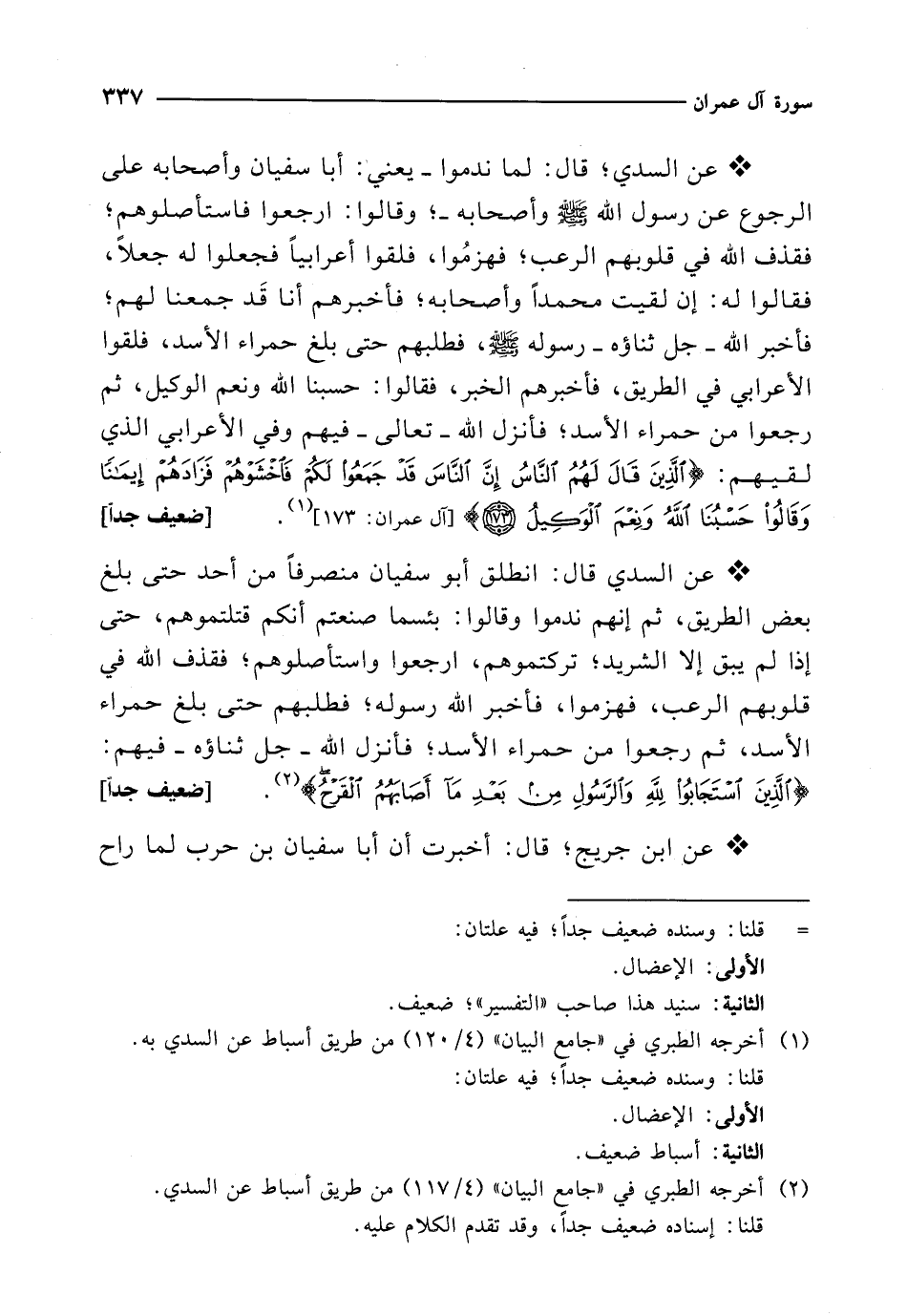 * عن السدي؛ قال: لما ندموا -يعني: أبا سفيان وأصحابه على الرجوع عن رسول الله - صلى الله عليه وسلم - وأصحابه-؛ وقالوا: ارجعوا فاستأصلوهم؛ فقذف الله في قلوبهم الرعب؛ فهزمُوا، فلقوا أعرابياً فجعلوا له جعلاً، فقالوا له: إن لقيت محمداً وأصحابه؛ فأخبرهم أنا قَد جمعنا لهم؛ فأخبر الله -جل ثناؤه- رسوله - صلى الله عليه وسلم -، فطلبهم حتى بلغ حمراء الأسد، فلقوا الأعرابي في الطريق، فأخبرهم الخبر، فقالوا: حسبنا الله ونعم الوكيل، ثم رجعوا من حمراء الأسد؛ فأنزل الله -تعالى- فيهم وفي الأعرابي الذي لقيهم: {الَّذِينَ قَالَ لَهُمُ النَّاسُ إِنَّ النَّاسَ قَدْ جَمَعُوا لَكُمْ فَاخْشَوْهُمْ فَزَادَهُمْ إِيمَانًا وَقَالُوا حَسْبُنَا اللَّهُ وَنِعْمَ الْوَكِيلُ (173)} [آل عمران: 173] (¬1). [ضعيف جداً]