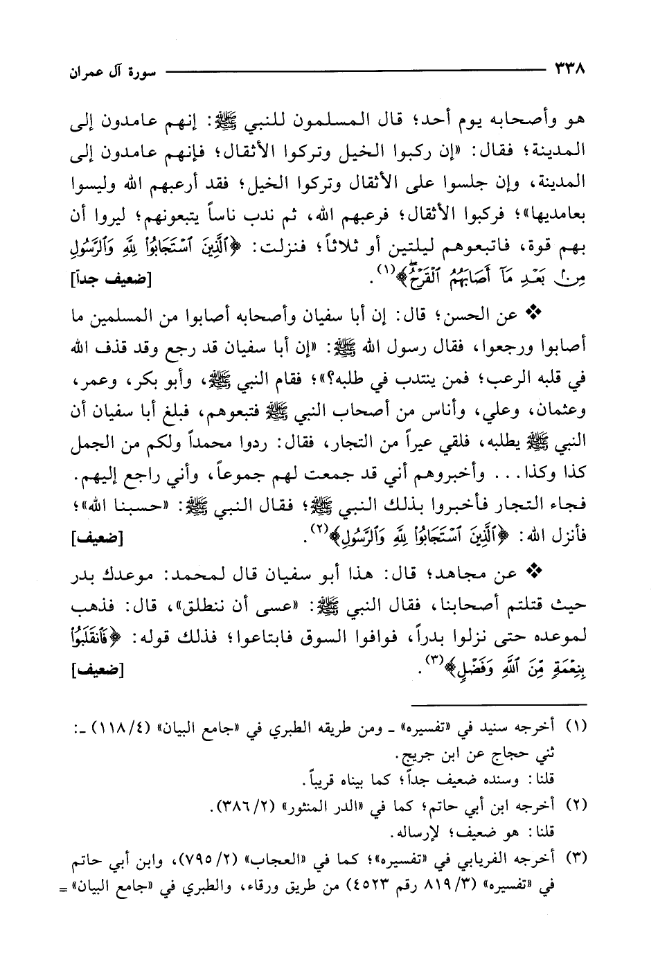فجاء التجار فأخبروا بذلك النبي - صلى الله عليه وسلم -؛ فقال النبي - صلى الله عليه وسلم -: "حسبنا الله"؛ فأنزل الله: {الَّذِينَ اسْتَجَابُوا لِلَّهِ وَالرَّسُولِ} (¬2). [ضعيف]