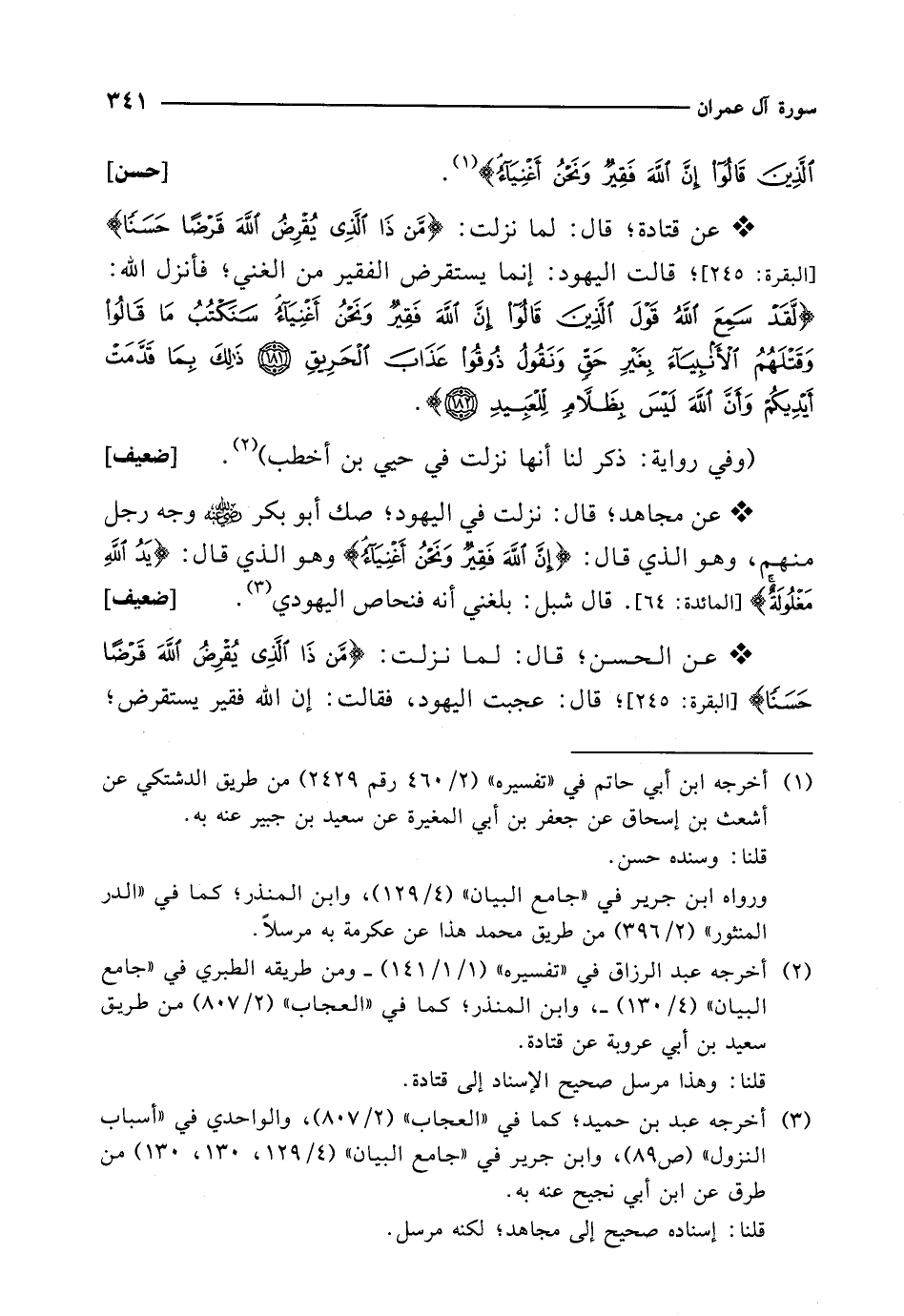 * عن قتادة؛ قال: لما نزلت: {مَنْ ذَا الَّذِي يُقْرِضُ اللَّهَ قَرْضًا حَسَنًا} [لبقرة: 245]؛ قالت اليهود: إنما يستقرض الفقير من الغني؛ فأنزل الله: {لَقَدْ سَمِعَ اللَّهُ قَوْلَ الَّذِينَ قَالُوا إِنَّ اللَّهَ فَقِيرٌ وَنَحْنُ أَغْنِيَاءُ سَنَكْتُبُ مَا قَالُوا وَقَتْلَهُمُ الْأَنْبِيَاءَ بِغَيْرِ حَقٍّ وَنَقُولُ ذُوقُوا عَذَابَ الْحَرِيقِ (181) ذَلِكَ بِمَا قَدَّمَتْ أَيْدِيكُمْ وَأَنَّ اللَّهَ لَيْسَ بِظَلَّامٍ لِلْعَبِيدِ (182)}.