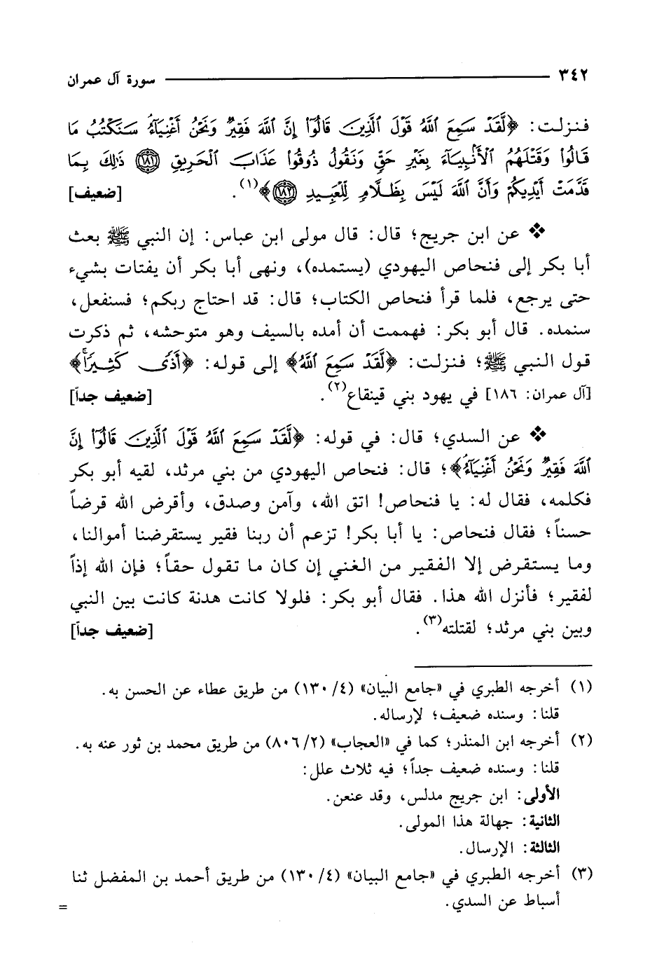 * عن ابن جريج؛ قال: قال مولى ابن عباس: إن النبي - صلى الله عليه وسلم - بعث أبا بكر إلى فنحاص اليهودي (يستمده)، ونهى أبا بكر أن يفتات بشيء حتى يرجع، فلما قرأ فنحاص الكتاب؛ قال: قد احتاج ربكم؛ فسنفعل، سنمده. قال أبو بكر: فهممت أن أمده بالسيف وهو متوحشه، ثم ذكرت قول النبي - صلى الله عليه وسلم -؛ فنزلت: {لَقَدْ سَمِعَ اللَّهُ} إلى قوله: {أَذًى كَثِيرًا} [آل عمران: 186] في يهود بني قينقاع (¬2). [ضعيف جداً]