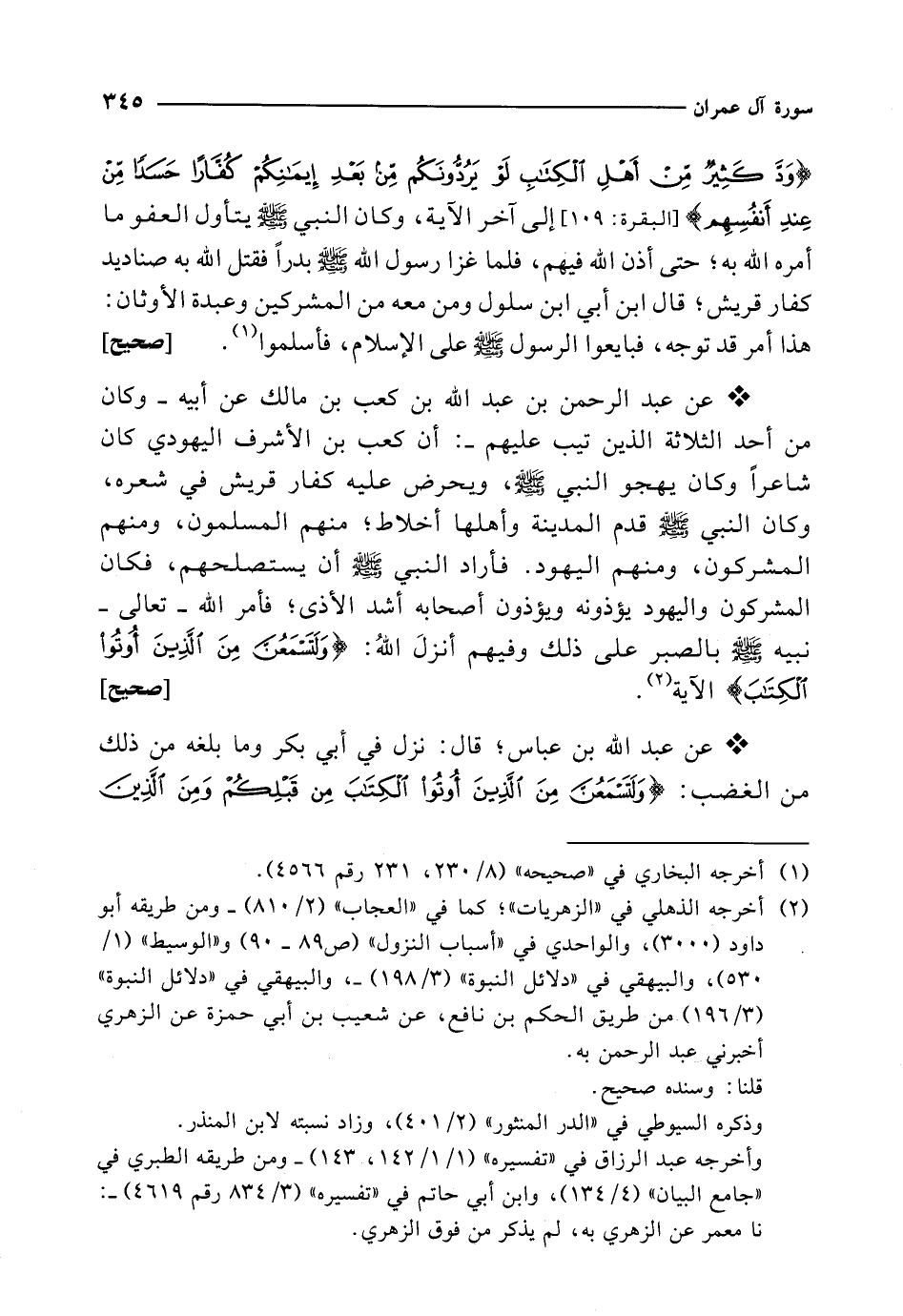 * عن عبد الرحمن بن عبد الله بن كعب بن مالك عن أبيه -وكان من أحد الثلاثة الذين تيب عليهم-: أن كعب بن الأشرف اليهودي كان شاعراً وكان يهجو النبي - صلى الله عليه وسلم -، ويحرض عليه كفار قريش في شعره، وكان النبي - صلى الله عليه وسلم - قدم المدينة وأهلها أخلاط؛ منهم المسلمون، ومنهم المشركون، ومنهم اليهود. فأراد النبي - صلى الله عليه وسلم - أن يستصلحهم، فكان المشركون واليهود يؤذونه ويؤذون أصحابه أشد الأذى؛ فأمر الله -تعالى- نبيه - صلى الله عليه وسلم - بالصبر على ذلك وفيهم أنزلَ اللهُ: {وَلَتَسْمَعُنَّ مِنَ الَّذِينَ أُوتُوا الْكِتَابَ} الآية (¬2). [صحيح]