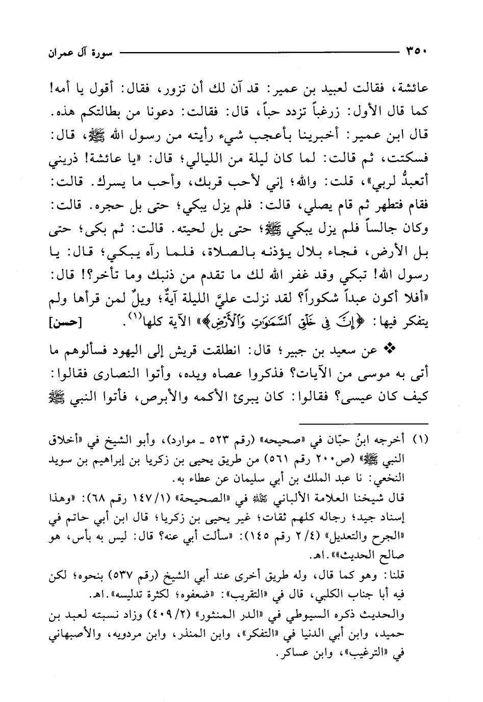 قال ابن عمير: أخبرينا بأعجب شيء رأيته من رسول الله - صلى الله عليه وسلم -، قال: فسكتت، ثم قالت: لما كان ليلة من الليالي؛ قال: "يا عائشة! ذريني أتعبدُّ لربي"، قلت: والله؛ إني لأحب قربك، وأحب ما يسرك. قالت: فقام فتطهر ثم قام يصلي، قالت: فلم يزل يبكي؛ حتى بل حجره. قالت: وكان جالساً فلم يزل يبكي - صلى الله عليه وسلم -؛ حتى بل لحيته. قالت: ثم بكى؛ حتى بل الأرض، فجاء بلال يؤذنه بالصلاة، فلما رآه يبكي؛ قال: يا رسول الله! تبكي وقد غفر الله لك ما تقدم من ذنبك وما تأخر؟! قال: "أفلا أكون عبداً شكوراً؟ لقد نزلت عليَّ الليلة آيةٌ؛ ويلٌ لمن قرأها ولم يتفكر فيها: {إِنَّ فِي خَلْقِ السَّمَاوَاتِ وَالْأَرْضِ} " الآية كلها (¬1). [حسن]