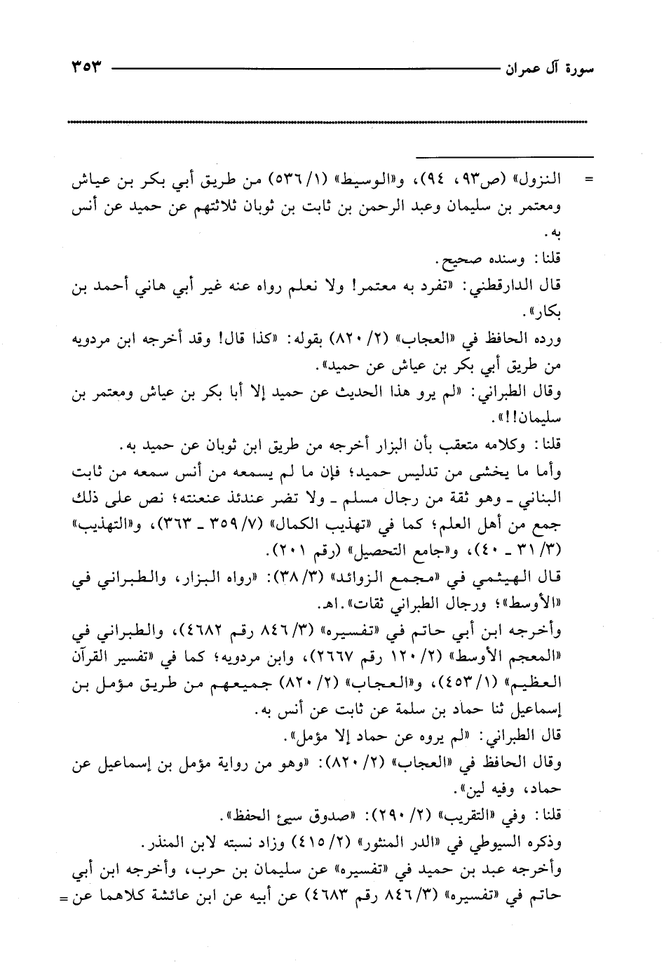 وقال الطبراني: "لم يرو هذا الحديث عن حميد إلا أبا بكر بن عياش ومعتمر بن سليمان!! ".
