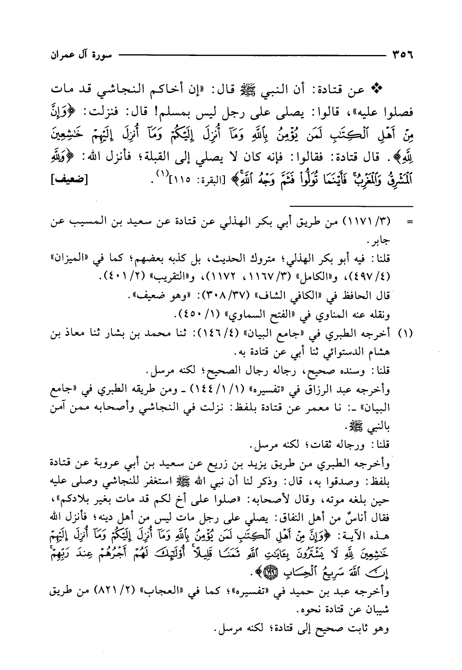 * عن قتادة: أن النبي - صلى الله عليه وسلم - قال: "إن أخاكم النجاشي قد مات فصلوا عليه"، قالوا: يصلى على رجل ليس بمسلم! قال: فنزلت: {وَإِنَّ مِنْ أَهْلِ الْكِتَابِ لَمَنْ يُؤْمِنُ بِاللَّهِ وَمَا أُنْزِلَ إِلَيْكُمْ وَمَا أُنْزِلَ إِلَيْهِمْ خَاشِعِينَ لِلَّهِ}. قال قتادة: فقالوا: فإنه كان لا يصلي إلى القبلة؛ فأنزل الله: {وَلِلَّهِ الْمَشْرِقُ وَالْمَغْرِبُ فَأَيْنَمَا تُوَلُّوا فَثَمَّ وَجْهُ اللَّهِ} [البقرة: 115] (¬1). [ضعيف]