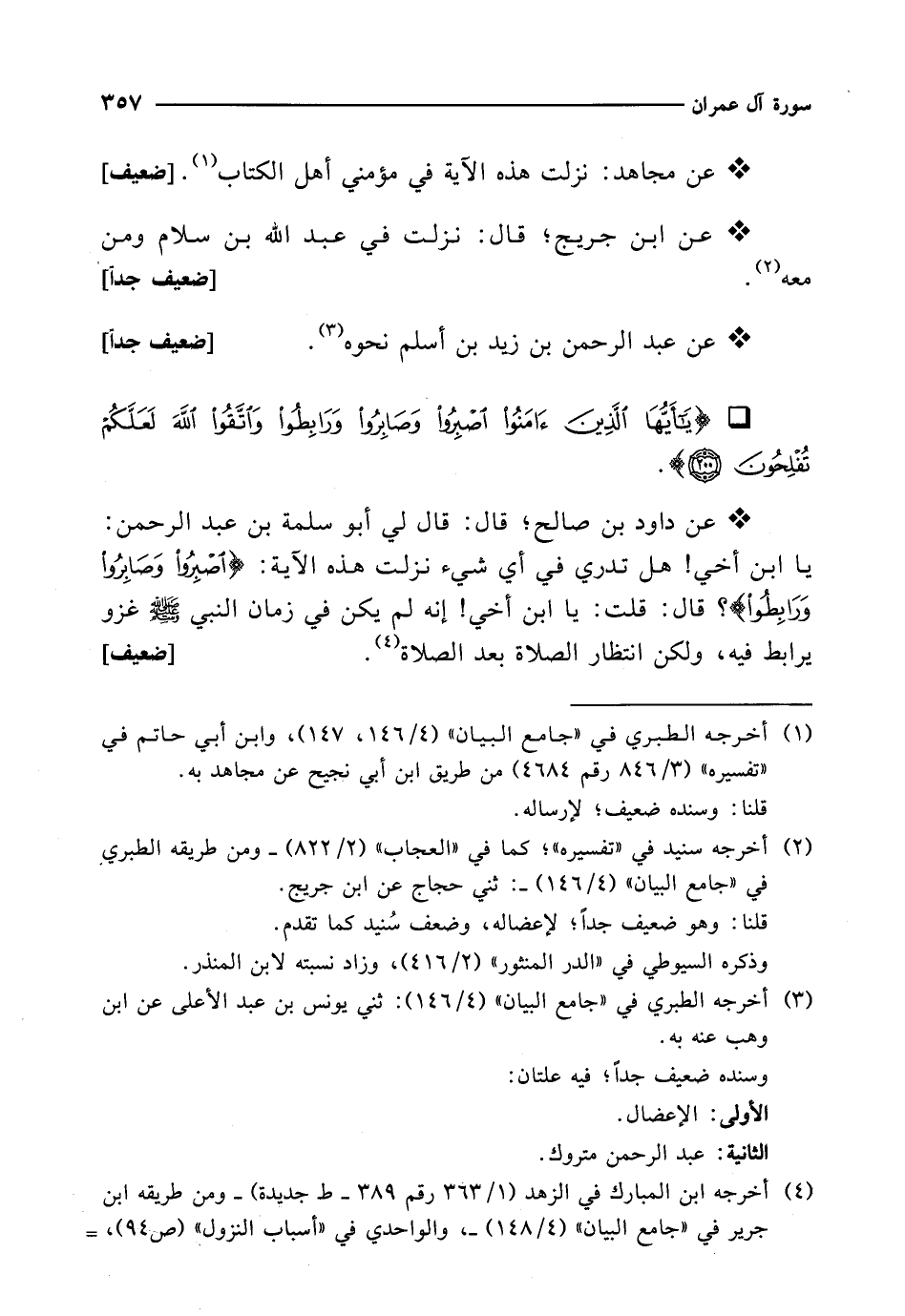 * عن داود بن صالح؛ قال: قال لي أبو سلمة بن عبد الرحمن: يا ابن أخي! هل تدري في أي شيء نزلت هذه الآية: {اصْبِرُوا وَصَابِرُوا وَرَابِطُوا}؟ قال: قلت: يا ابن أخي! إنه لم يكن في زمان النبي - صلى الله عليه وسلم - غزو يرابط فيه، ولكن انتظار الصلاة بعد الصلاة (¬4). [ضعيف]