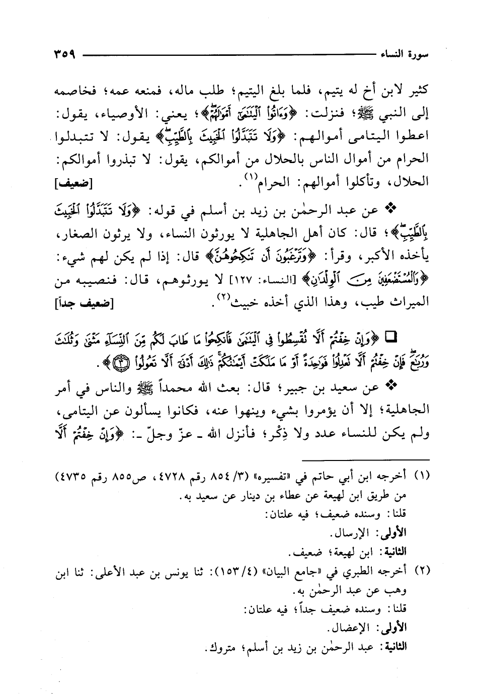 * عن عبد الرحمن بن زيد بن أسلم في قوله: {وَلَا تَتَبَدَّلُوا الْخَبِيثَ بِالطَّيِّبِ}؛ قال: كان أهل الجاهلية لا يورثون النساء، ولا يرثون الصغار، يأخذه الأكبر، وقرأ: {وَتَرْغَبُونَ أَنْ تَنْكِحُوهُنَّ} قال: إذا لم يكن لهم شيء: {وَالْمُسْتَضْعَفِينَ مِنَ الْوِلْدَانِ} [النساء: 127] لا يورثوهم، قال: فنصيبه من الميراث طيب، وهذا الذي أخذه خبيث (¬2). [ضعيف جداً]