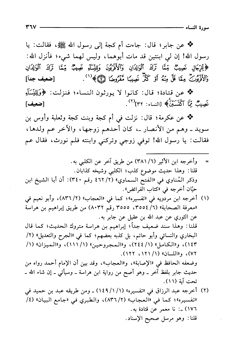 * عن جابر؛ قال: جاءت أم كجة إلى رسول الله - صلى الله عليه وسلم -، فقالت: يا رسول الله! إن لي ابنتين قد مات أبوهما, وليس لهما شيء؛ فأنزل الله: {لِلرِّجَالِ نَصِيبٌ مِمَّا تَرَكَ الْوَالِدَانِ وَالْأَقْرَبُونَ وَلِلنِّسَاءِ نَصِيبٌ مِمَّا تَرَكَ الْوَالِدَانِ وَالْأَقْرَبُونَ مِمَّا قَلَّ مِنْهُ أَوْ كَثُرَ نَصِيبًا مَفْرُوضًا (7)} (¬1). [ضعيف جداً]