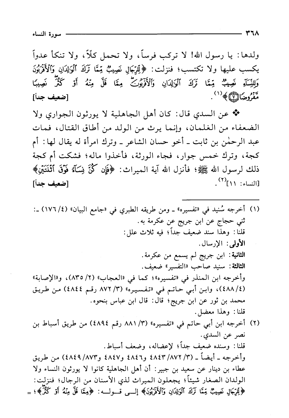* عن السدي قال: كان أهل الجاهلية لا يورثون الجواري ولا الضعفاء من الغلمان، وإنما يرث من الولد من أطاق القتال، فمات عبد الرحمن بن ثابت -أخو حسان الشاعر- وترك امرأة له يقال لها: أم كجة، وترك خمس جوار، فجاء الورثة، فأخذوا ماله؛ فشكت أم كجة ذلك لرسول الله - صلى الله عليه وسلم - فأنزل الله آية الميراث: {فَإِنْ كُنَّ نِسَاءً فَوْقَ اثْنَتَيْنِ} [النساء: 11] (¬2). [ضعيف جداً]