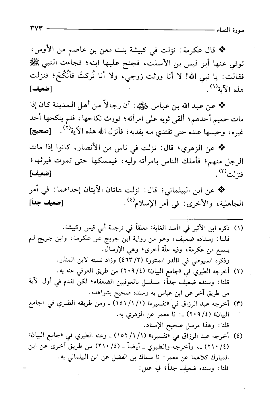 * عن الزهري؛ قال: نزلت في ناس من الأنصار، كانوا إذا مات الرجل منهم؛ فأملك الناس بامرأته وليه، فيمسكها حتى تموت فيرثها؛ فنزلت (¬3). [ضعيف]