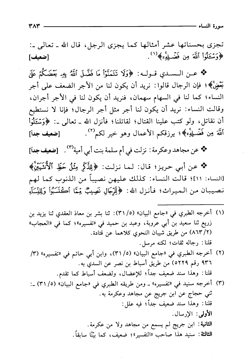 * عن السدي قوله: {وَلَا تَتَمَنَّوْا مَا فَضَّلَ اللَّهُ بِهِ بَعْضَكُمْ عَلَى بَعْضٍ}؛ فإن الرجال قالوا: نريد أن يكون لنا من الأجر الضعف على أجر النساء؛ كما لنا في السهام سهمان، فنريد أن يكون لنا في الأجر أجران، وقالت النساء: نريد أن يكون لنا أجر مثل أجر الرجال؛ فإنا لا نستطيع أن نقاتل، ولو كتب علينا القتال؛ لقاتلنا؛ فأنزل الله -تعالى-: {وَاسْأَلُوا اللَّهَ مِنْ فَضْلِهِ}؛ يرزقكم الأعمال وهو خير لكم (¬2). [ضعيف جداً]
