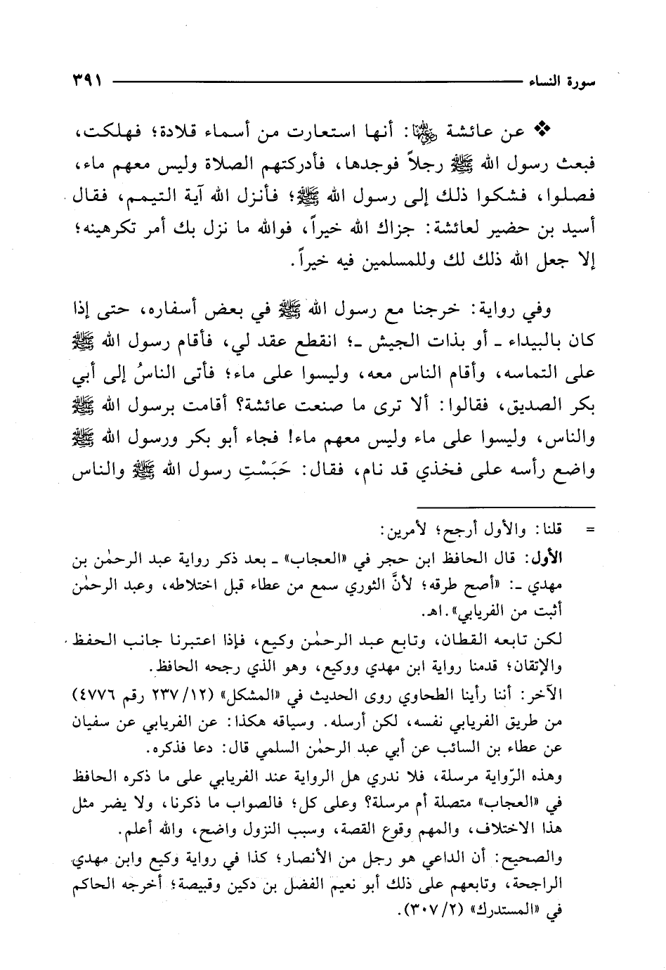* عن عائشة -رضي الله عنها-: أنها استعارت من أسماء قلادة؛ فهلكت، فبعث رسول الله - صلى الله عليه وسلم - رجلاً فوجدها، فأدركتهم الصلاة وليس معهم ماء، فصلوا، فشكوا ذلك إلى رسول الله - صلى الله عليه وسلم -؛ فأنزل الله آية التيمم، فقالا أسيد بن حضير لعائشة: جزاك الله أخيراً، فوالله ما نزل بك أمر تكرهينه؛ إلا جعل الله ذلك لك وللمسلمين فيه خيراً.