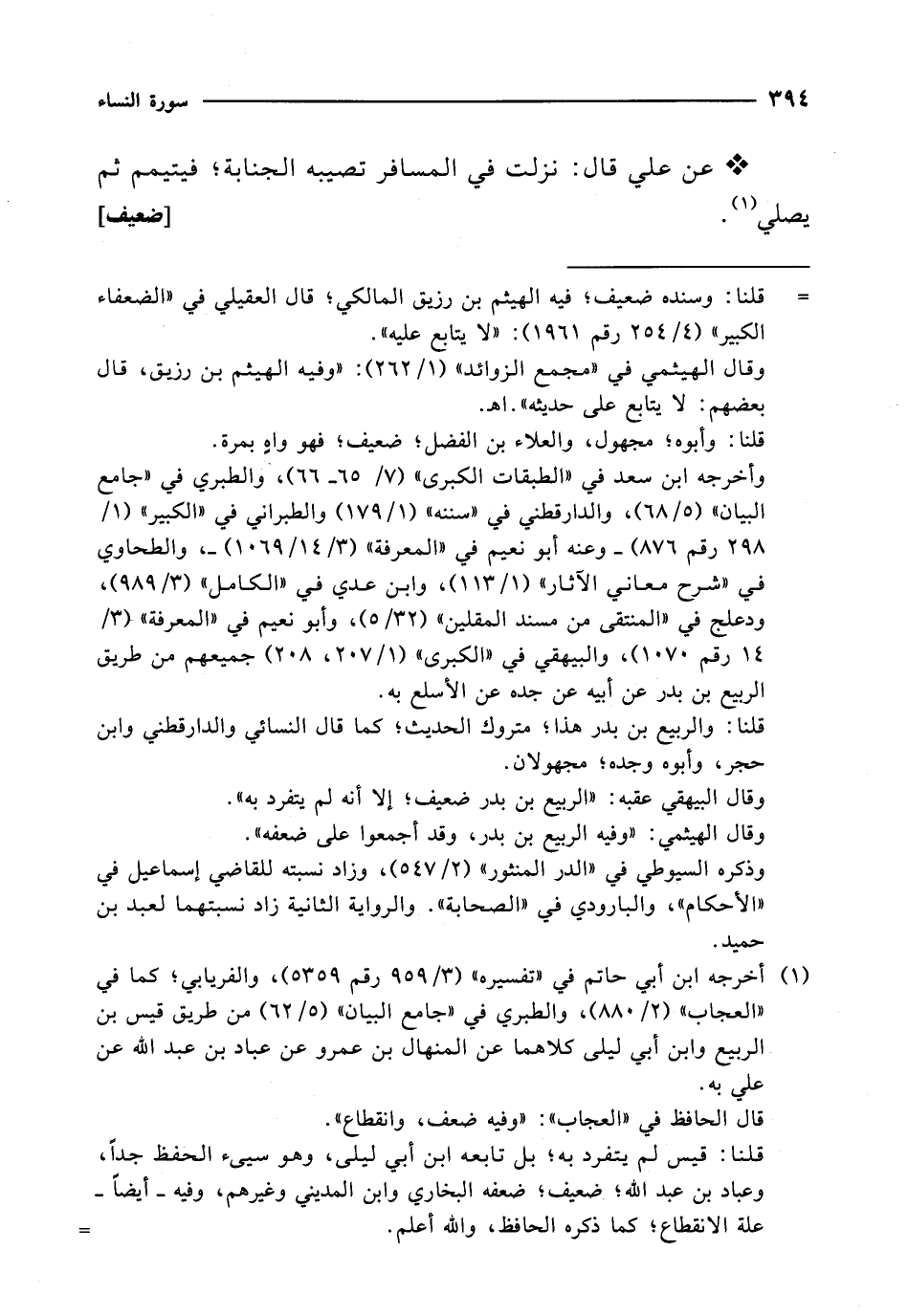 (¬1) أخرجه ابن أبي حاتم في "تفسيره" (3/ 959 رقم 5359)، والفريابي؛ كما في "العجاب" (2/ 880)، والطبري في "جامع البيان" (5/ 62) من طريق قيس بن الربيع وابن أبي ليلى كلاهما عن المنهال بن عمرو عن عباد بن عبد الله عن علي به.