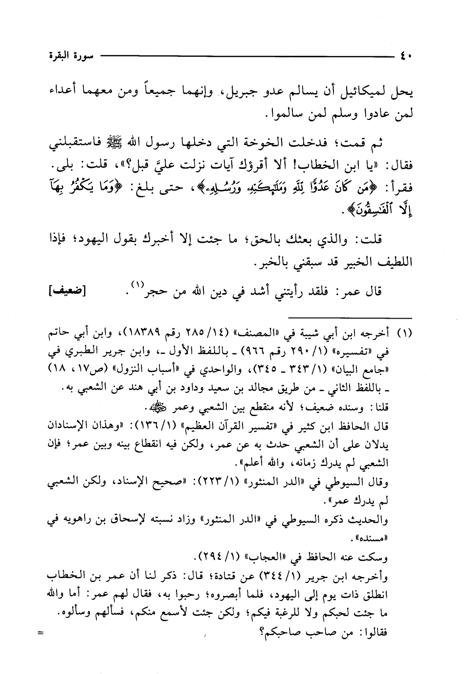 قال الحافظ ابن كثير في "تفسير القرآن العظيم" (1/ 136): "وهذان الإسنادان يدلان على أن الشعبي حدث به عن عمر، ولكن فيه انقطاع بينه وبين عمر؛ فإن الشعبي لم يدرك زمانه، والله أعلم".