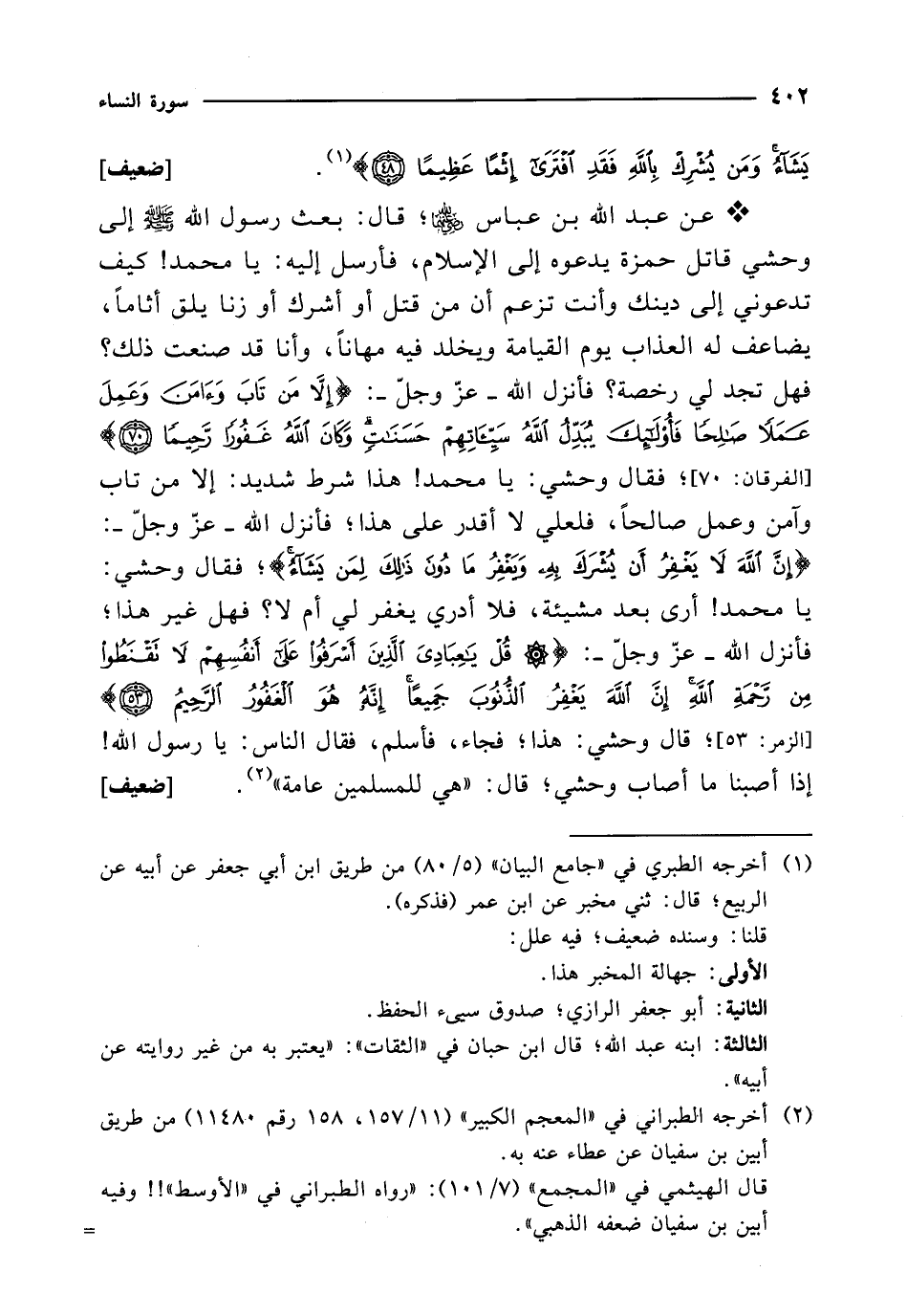 * عن عبد الله بن عباس -رضي الله عنهما-؛ قال: بعث رسول الله - صلى الله عليه وسلم - إلى وحشي قاتل حمزة يدعوه إلى الإِسلام، فأرسل إليه: يا محمد! كيف تدعوني إلى دينك وأنت تزعم أن من قتل أو أشرك أو زنا يلق أثاماً، يضاعف له العذاب يوم القيامة ويخلد فيه مهاناً، وأنا قد صنعت ذلك؟ فهل تجد لي رخصة؟ فأنزل الله -عزّ وجلّ-: {إِلَّا مَنْ تَابَ وَآمَنَ وَعَمِلَ عَمَلًا صَالِحًا فَأُولَئِكَ يُبَدِّلُ اللَّهُ سَيِّئَاتِهِمْ حَسَنَاتٍ وَكَانَ اللَّهُ غَفُورًا رَحِيمًا (70)} [الفرقان: 70]؛ فقال وحشي: يا محمد! هذا شرط شديد: إلا من تاب وآمن وعمل صالحاً، فلعلي لا أقدر على هذا؛ فأنزل الله -عزّ وجلّ-: {إِنَّ اللَّهَ لَا يَغْفِرُ أَنْ يُشْرَكَ بِهِ وَيَغْفِرُ مَا دُونَ ذَلِكَ لِمَنْ يَشَاءُ} فقال وحشي: يا محمد! أرى بعد مشيئة، فلا أدري يغفر لي أم لا؟ فهل غير هذا؛ فأنزل الله -عزّ وجلّ-: {قُلْ يَاعِبَادِيَ الَّذِينَ أَسْرَفُوا عَلَى أَنْفُسِهِمْ لَا تَقْنَطُوا مِنْ رَحْمَةِ اللَّهِ إِنَّ اللَّهَ يَغْفِرُ الذُّنُوبَ جَمِيعًا إِنَّهُ هُوَ الْغَفُورُ الرَّحِيمُ (53)} [الزمر: 53]؛ قال وحشي: هذا؛ فجاء، فأسلم، فقال الناس: يا رسول الله! إذا أصبنا ما أصاب وحشي؛ قال: "هي للمسلمين عامة" (¬2). [ضعيف]