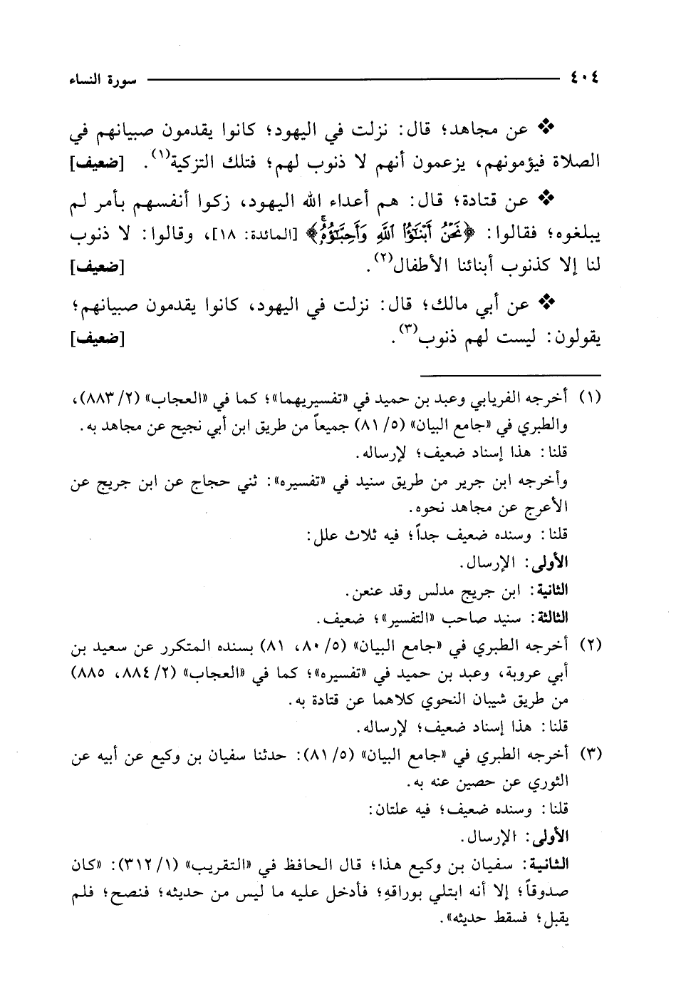 * عن أبي مالك؛ قال: نزلت في اليهود، كانوا يقدمون صبيانهم؛ يقولون: ليست لهم ذنوب (¬3). [ضعيف]