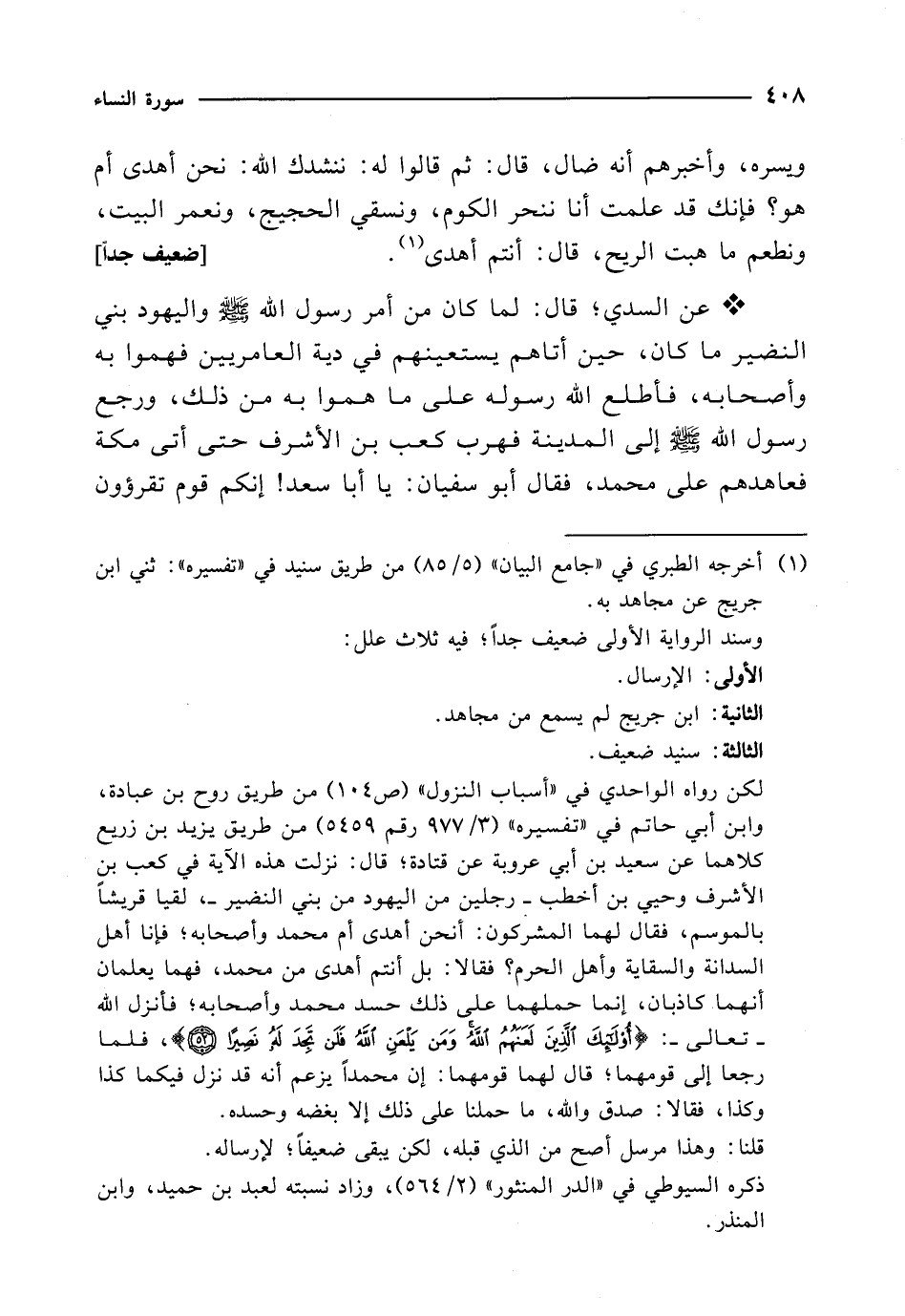 لكن رواه الواحدي في "أسباب النزول" (ص 104) من طريق روح بن عبادة، وابن أبي حاتم في "تفسيره" (3/ 977 رقم 5459) من طريق يزيد بن زريع كلاهما عن سعيد بن أبي عروبة عن قتادة؛ قال: نزلت هذه الآية في كعب بن الأشرف وحيي بن أخطب -رجلين من اليهود من بني النضير-، لقيا قريشاً بالموسم، فقال لهما المشركون: أنحن أهدى أم محمد وأصحابه؛ فإنا أهل السدانة والسقاية وأهل الحرم؟ فقالا: بل أنتم أهدى من محمد، فهما يعلمان أنهما كاذبان، إنما حملهما على ذلك حسد محمد وأصحابه؛ فأنزل الله -تعالى-: {أُولَئِكَ الَّذِينَ لَعَنَهُمُ اللَّهُ وَمَنْ يَلْعَنِ اللَّهُ فَلَنْ تَجِدَ لَهُ نَصِيرًا (52)}، فلما رجعا إلى قومهما؛ قال لهما قومهما: إن محمداً يزعم أنه قد نزل فيكما كذا وكذا، فقالا: صدق والله، ما حملنا على ذلك إلا بغضه وحسده.