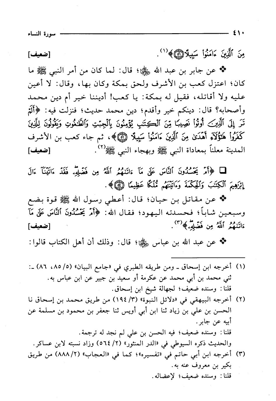 * عن جابر بن عبد الله -رضي الله عنهما-؛ قال: لما كان من أمر النبي - صلى الله عليه وسلم - ما كان؛ اعتزل كعب بن الأشرف ولحق بمكة وكان بها، وقال: لا أعين عليه ولا أقاتله، فقيل له بمكة: يا كعب! أديننا خير أم دين محمد وأصحابه؟ قال: دينكم خير وأقدم؛ دين محمد حديث؛ فنزلت فيه: {أَلَمْ تَرَ إِلَى الَّذِينَ أُوتُوا نَصِيبًا مِنَ الْكِتَابِ يُؤْمِنُونَ بِالْجِبْتِ وَالطَّاغُوتِ وَيَقُولُونَ لِلَّذِينَ كَفَرُوا هَؤُلَاءِ أَهْدَى مِنَ الَّذِينَ آمَنُوا سَبِيلًا (51)}، ثم جاء كعب بن الأشرف المدينة معلناً بمعاداة النبي - صلى الله عليه وسلم - وبهجاء النبي - صلى الله عليه وسلم - (¬2). [ضعيف]