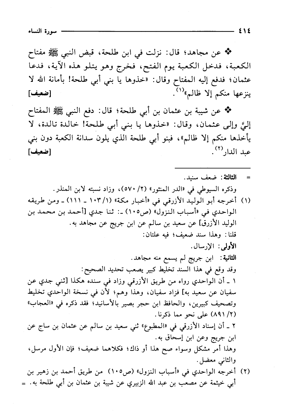 (¬2) أخرجه الواحدي في "أسباب النزول" (ص 105) من طريق أحمد بن زهير بن أبي خيثمة عن مصعب بن عبد الله الزبيري عن شيبة بن عثمان بن أبي طلحة به. =